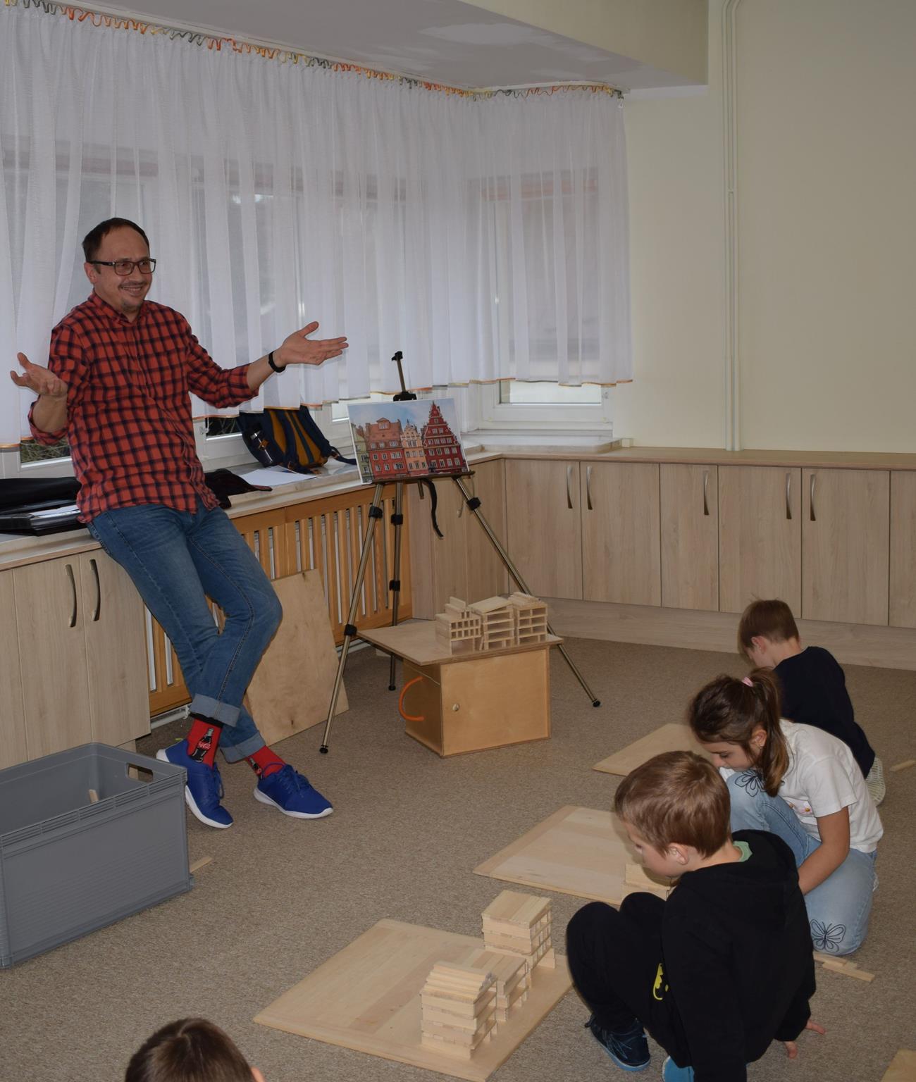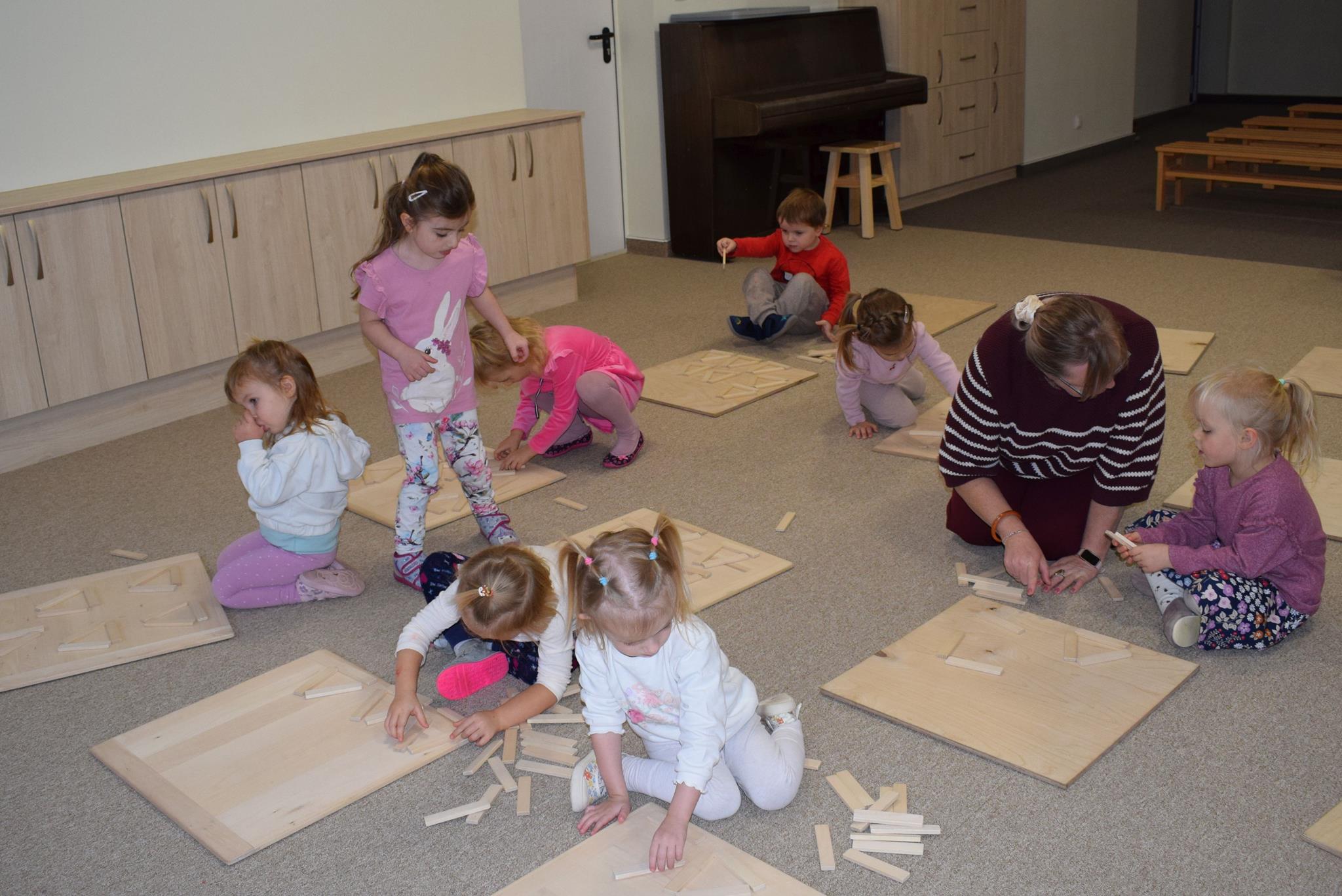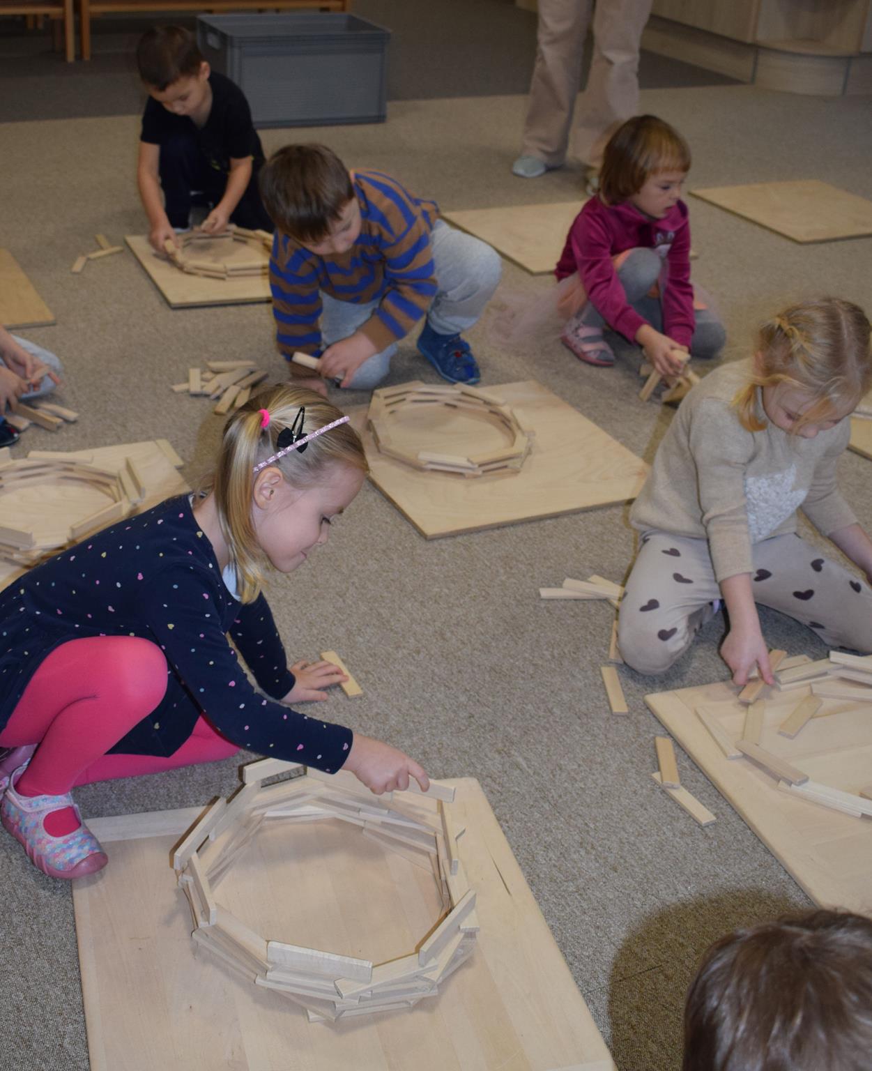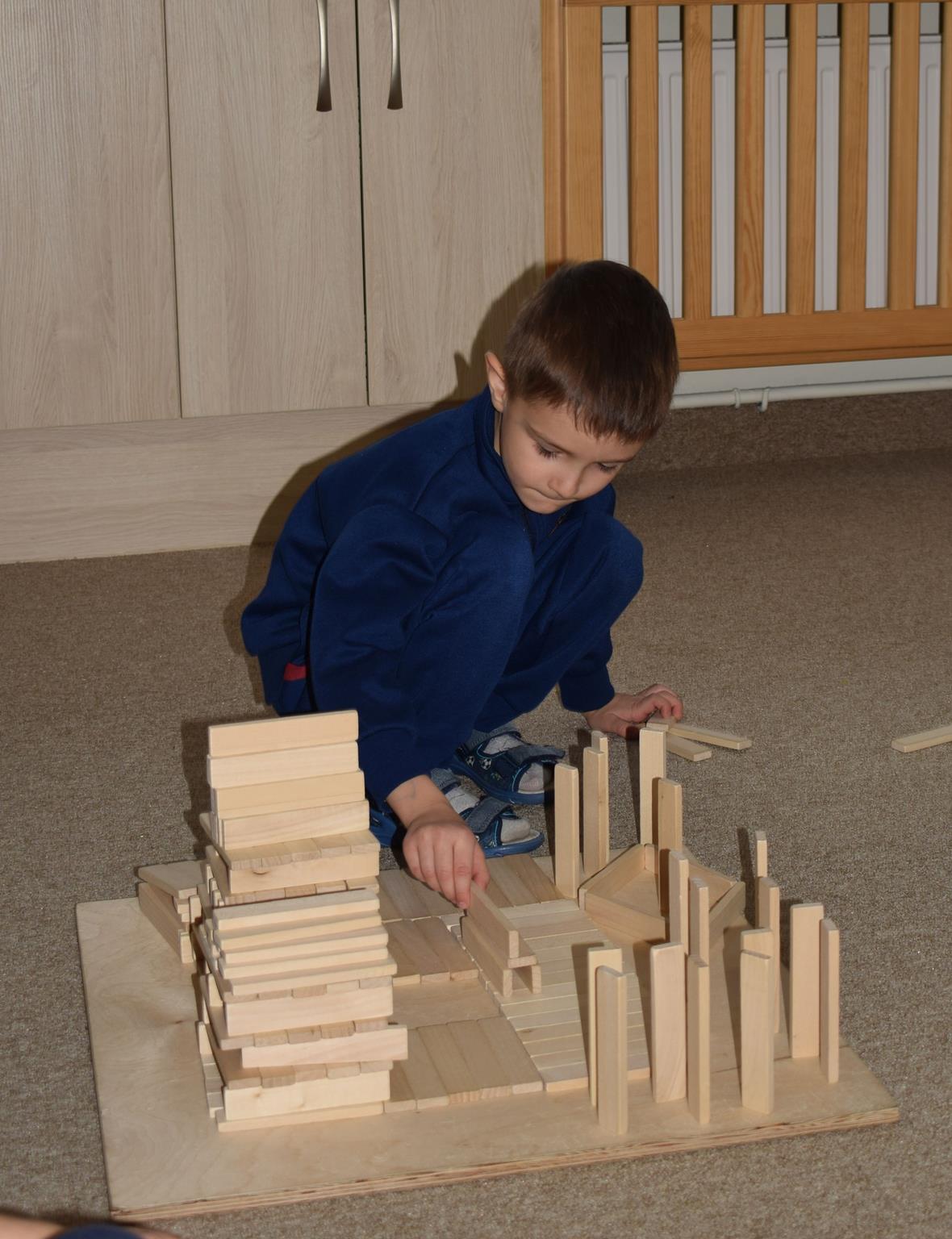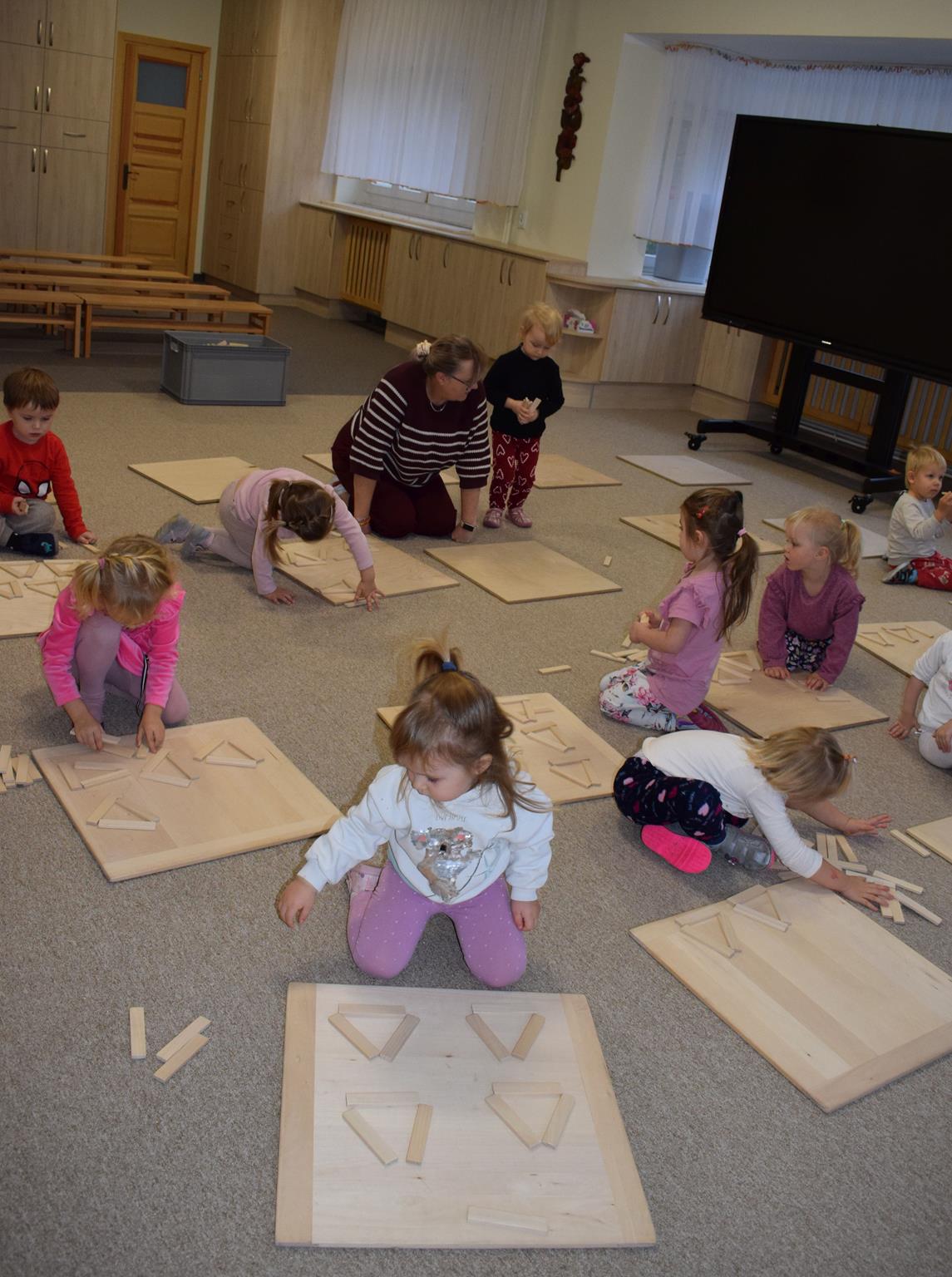 Po raz kolejny w tym roku dzieci uczestniczyły w warsztatach Małego Architekta. Wznosiły budowle pod czujnym okiem Pana Kreatka, musiały się wykazać umiejętnością uważnego słuchania, znajomością podstaw matematyki, a także zmysłem estetycznym, inicjatywą i umiejętnościami organizacyjnymi. Na pierwszy ogień poszły podstawowe konstrukcje geometryczne, takie jak trójkąty, kwadraty i koła. Motylki próbowały swoich sił we wznoszeniu budowli przypominającej rzymskie koloseum. Starszaki reprezentując wyższy poziom umiejętności, bo przecież to już trzeci rok, jak szlifują wymienione umiejętności, wznosiły budowle przypominające te z Rynku Starego Miasta w stolicy.