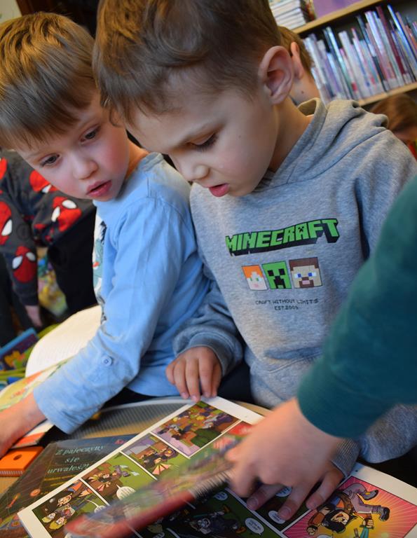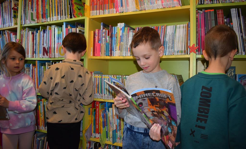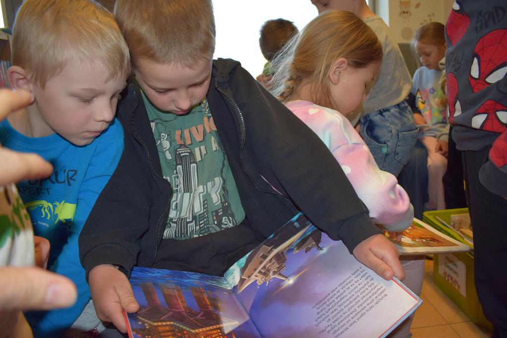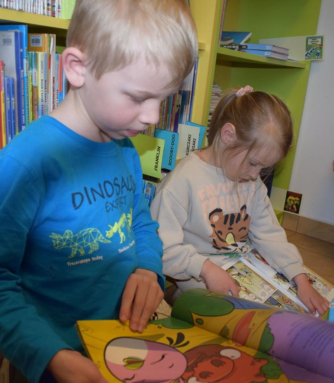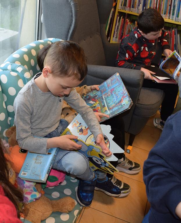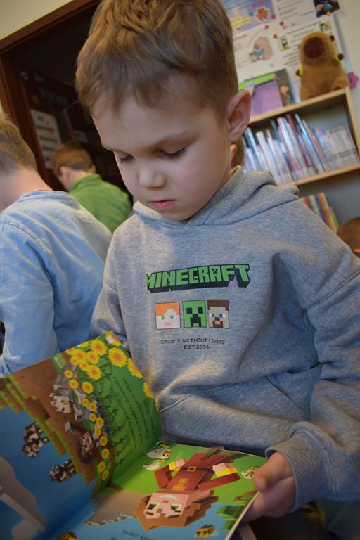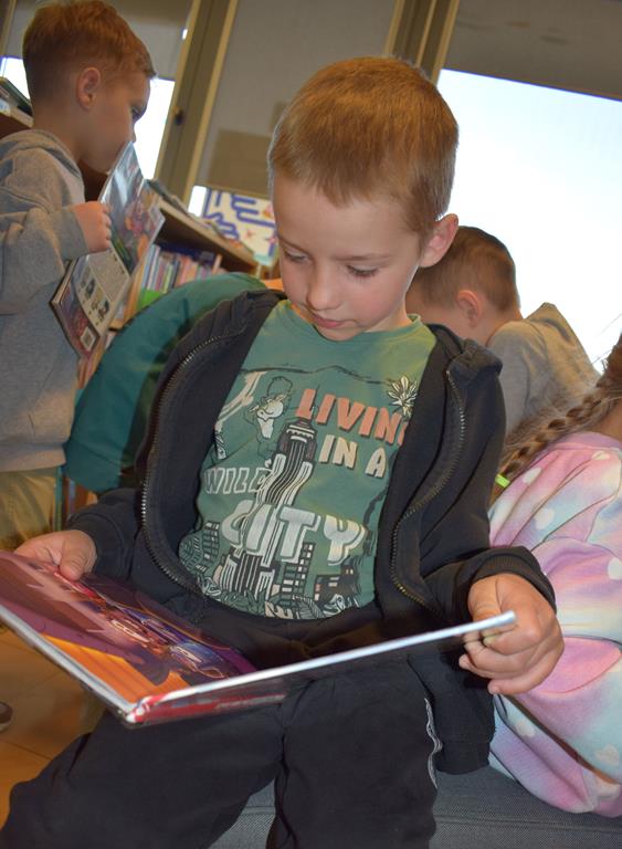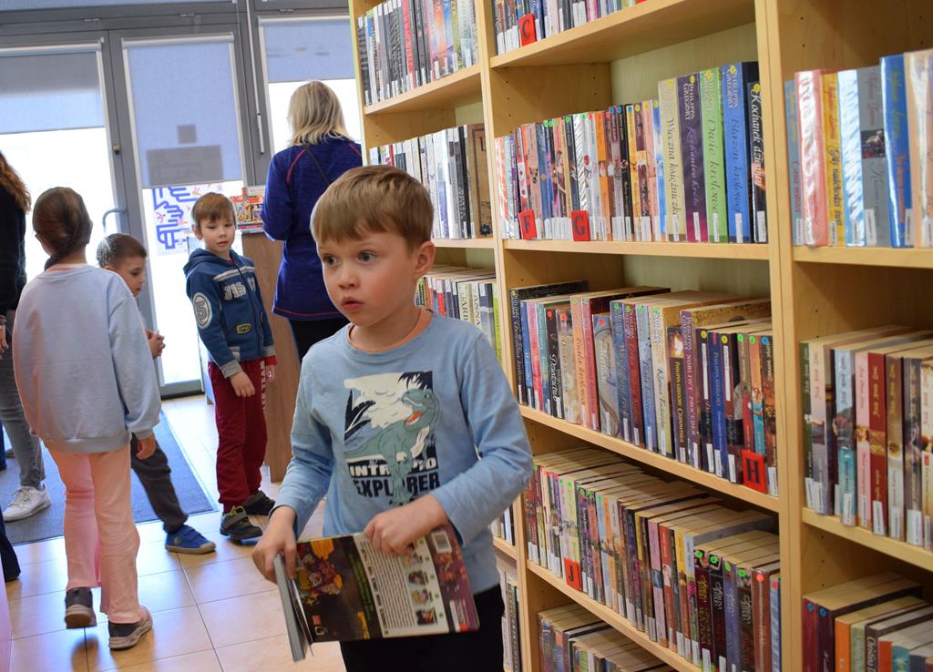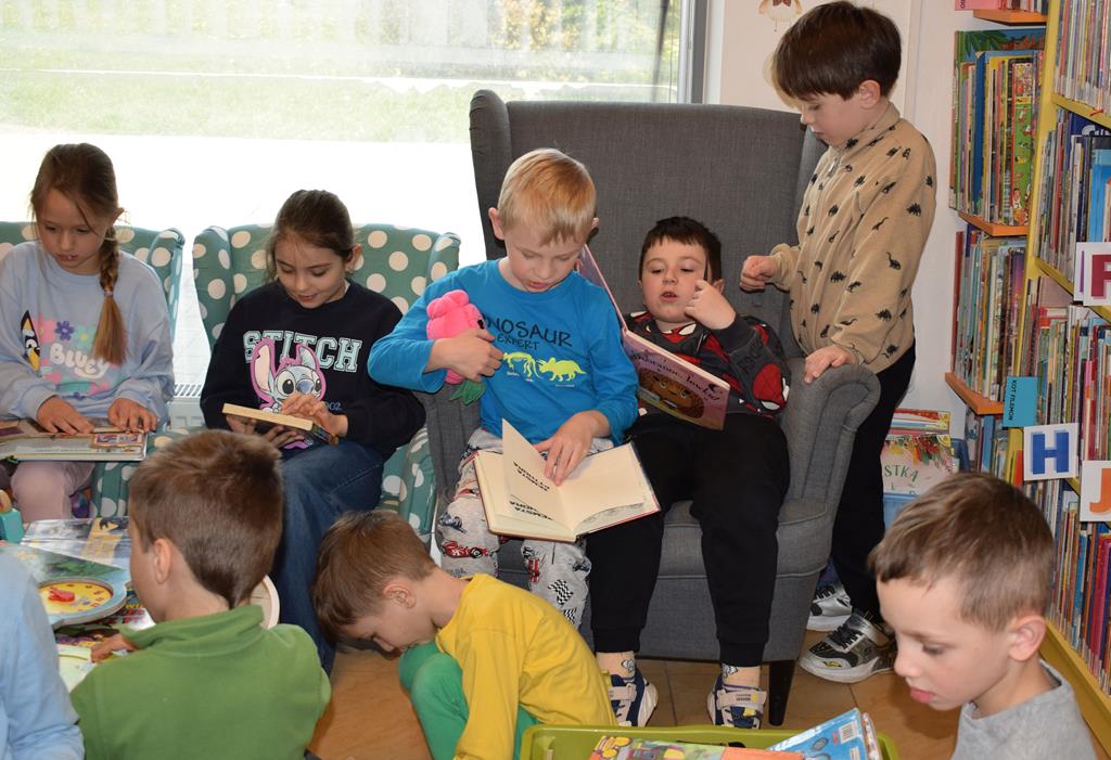 Dzieci z gr. Sówek udały się do pobliskiej biblioteki publicznej, gdzie wzięły udział w zajęciach bibliotecznych. Część dzieci odwiedzała bibliotekę już wcześniej, jednak dla wielu przedszkolaków było to pierwsze spotkanie z tym wyjątkowym miejscem. Pani bibliotekarka opowiedziała dzieciom, kiedy książki „się smucą”, a kiedy „cieszą”. Wspólnie ustalono zasady obowiązujące czytelnika, dotyczące właściwego zachowania w bibliotece oraz odpowiedniego obchodzenia się z książkami. Z obrazków przedstawiających dobre nawyki powstał „Kodeks przyjaciela książek”. Przedszkolaki wysłuchały również opowieści o dinozaurach, z której dowiedziały się, że biblioteka jest miejscem otwartym dla każdego i każdy może znaleźć w niej coś ciekawego dla siebie. Następnie dzieci odwiedziły kącik czytelniczy, gdzie z zainteresowaniem oglądały wybrane pozycje. Niektóre Sówki tak zaciekawiły się wybranymi książkami, że zapragnęły wrócić w to miejsce i wypożyczyć je do domu. Wizyta w bibliotece była dla dzieci ciekawym doświadczeniem, które rozbudziło ich zainteresowanie literaturę dziecięcą.