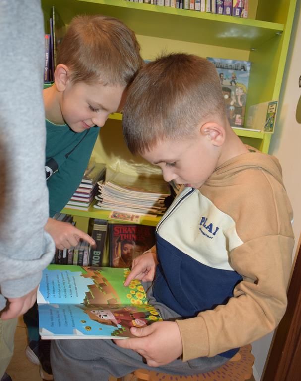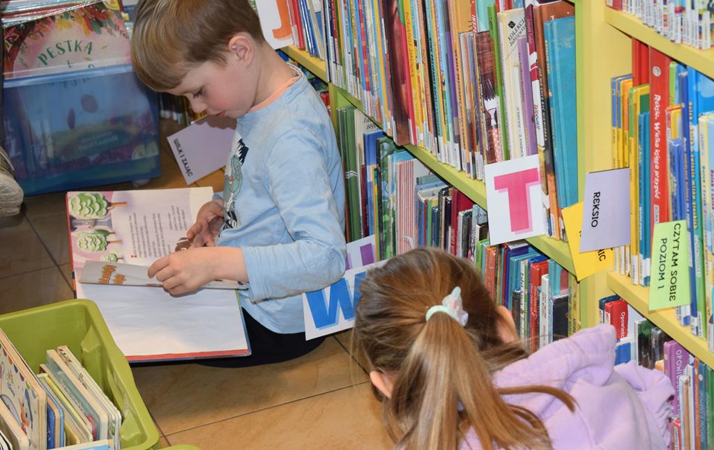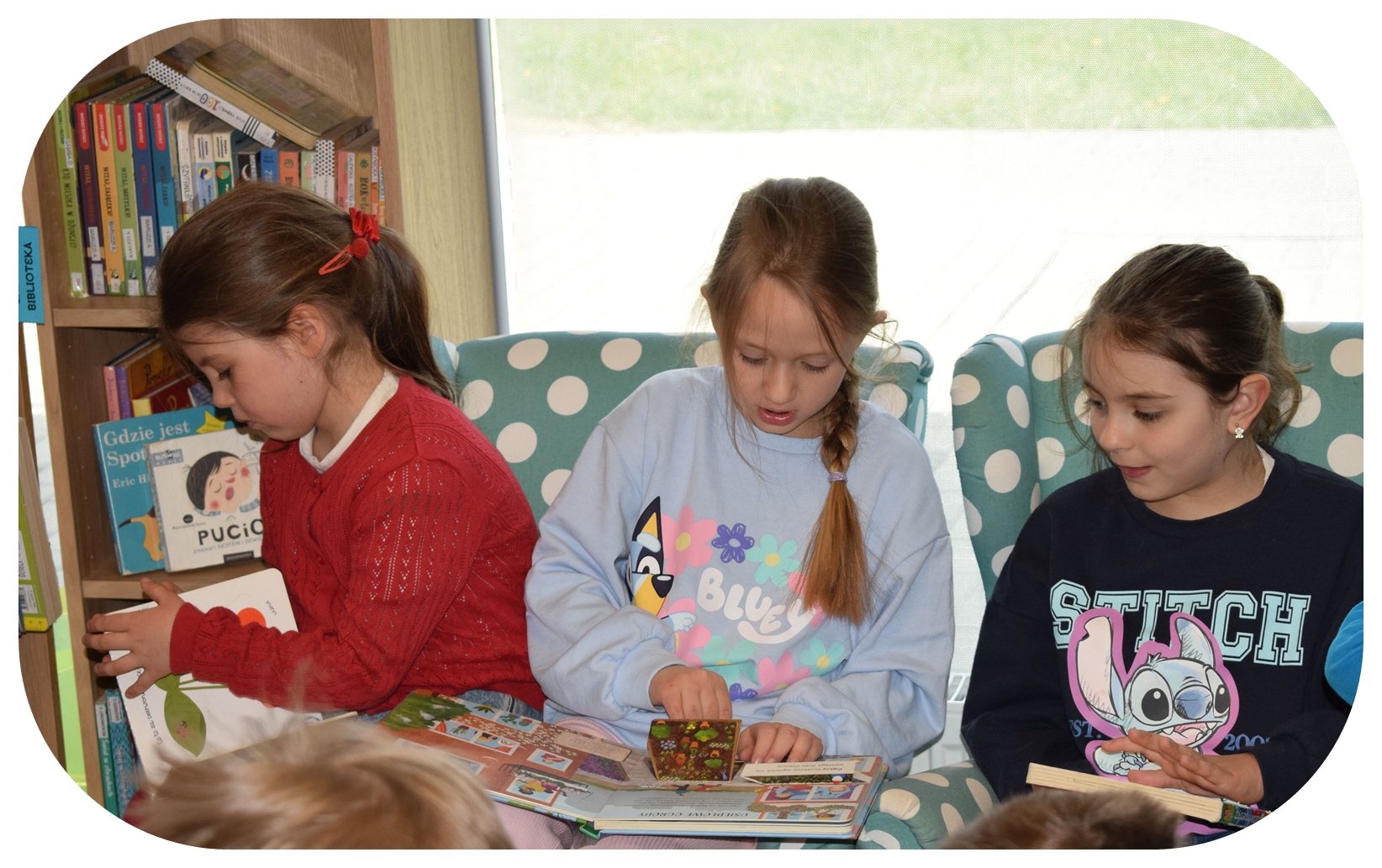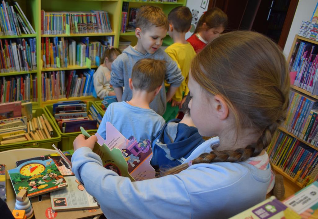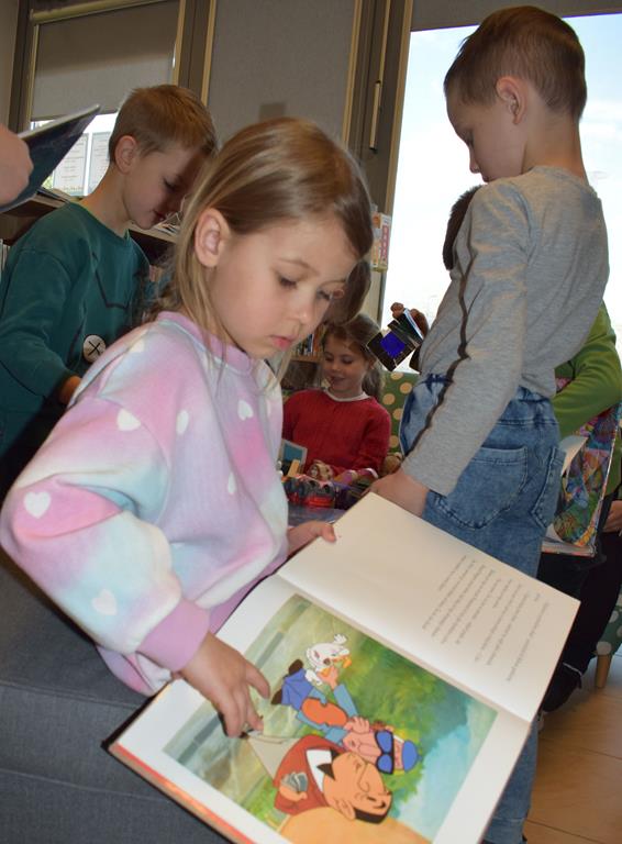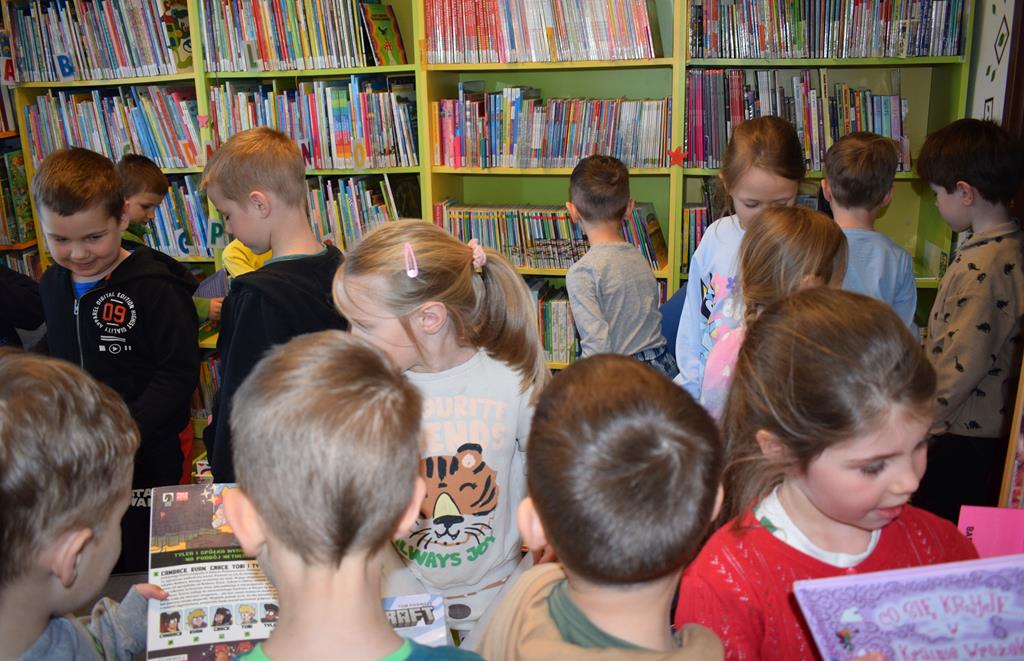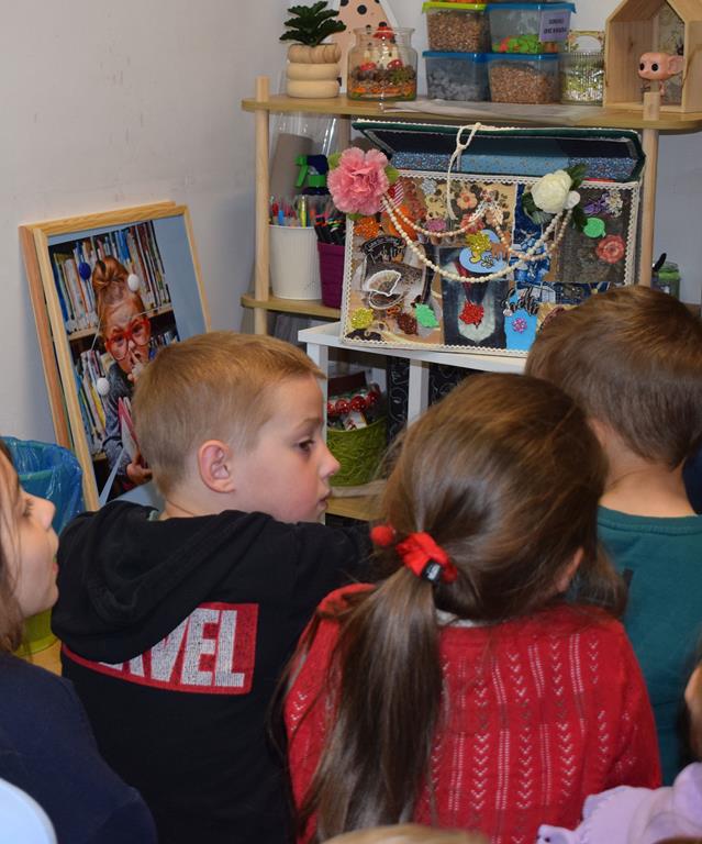 Dzieci z gr. Sówek udały się do pobliskiej biblioteki publicznej, gdzie wzięły udział w zajęciach bibliotecznych. Część dzieci odwiedzała bibliotekę już wcześniej, jednak dla wielu przedszkolaków było to pierwsze spotkanie z tym wyjątkowym miejscem. Pani bibliotekarka opowiedziała dzieciom, kiedy książki „się smucą”, a kiedy „cieszą”. Wspólnie ustalono zasady obowiązujące czytelnika, dotyczące właściwego zachowania w bibliotece oraz odpowiedniego obchodzenia się z książkami. Z obrazków przedstawiających dobre nawyki powstał „Kodeks przyjaciela książek”. Przedszkolaki wysłuchały również opowieści o dinozaurach, z której dowiedziały się, że biblioteka jest miejscem otwartym dla każdego i każdy może znaleźć w niej coś ciekawego dla siebie. Następnie dzieci odwiedziły kącik czytelniczy, gdzie z zainteresowaniem oglądały wybrane pozycje. Niektóre Sówki tak zaciekawiły się wybranymi książkami, że zapragnęły wrócić w to miejsce i wypożyczyć je do domu. Wizyta w bibliotece była dla dzieci ciekawym doświadczeniem, które rozbudziło ich zainteresowanie literaturę dziecięcą.