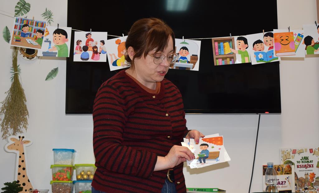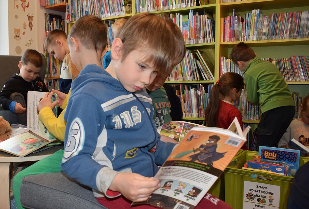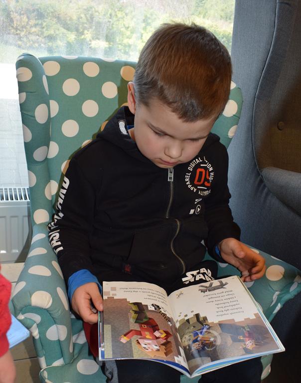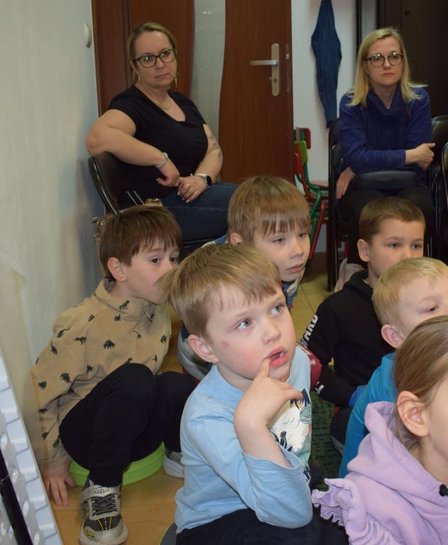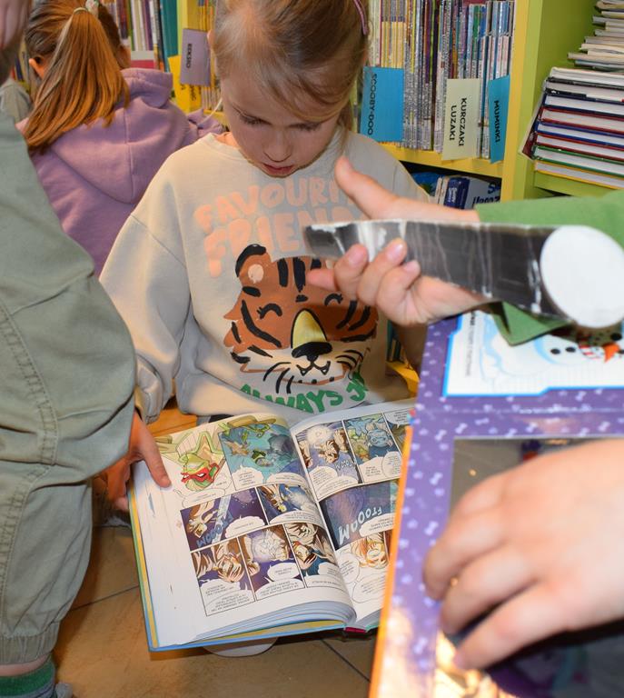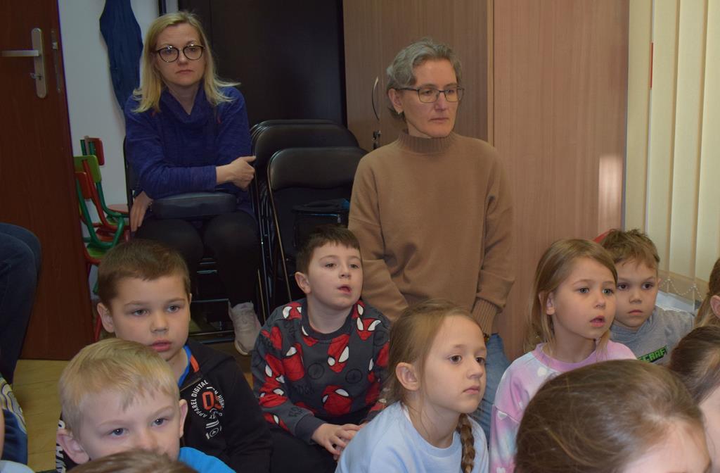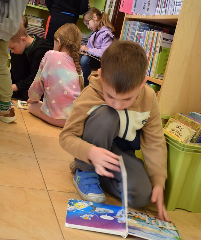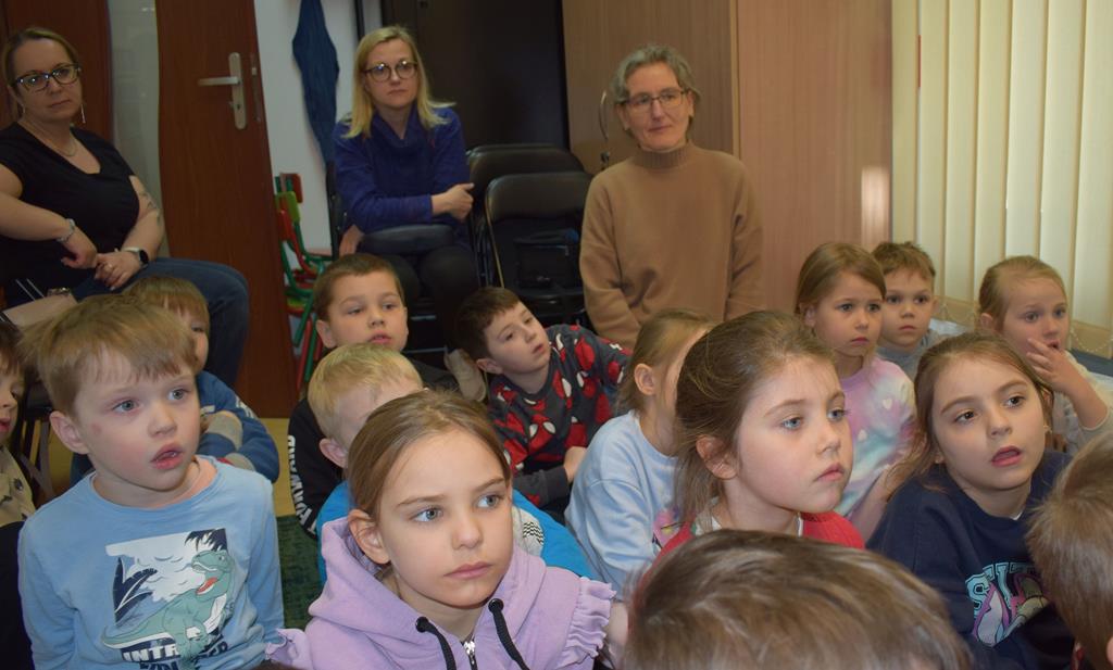 Dzieci z gr. Sówek udały się do pobliskiej biblioteki publicznej, gdzie wzięły udział w zajęciach bibliotecznych. Część dzieci odwiedzała bibliotekę już wcześniej, jednak dla wielu przedszkolaków było to pierwsze spotkanie z tym wyjątkowym miejscem. Pani bibliotekarka opowiedziała dzieciom, kiedy książki „się smucą”, a kiedy „cieszą”. Wspólnie ustalono zasady obowiązujące czytelnika, dotyczące właściwego zachowania w bibliotece oraz odpowiedniego obchodzenia się z książkami. Z obrazków przedstawiających dobre nawyki powstał „Kodeks przyjaciela książek”. Przedszkolaki wysłuchały również opowieści o dinozaurach, z której dowiedziały się, że biblioteka jest miejscem otwartym dla każdego i każdy może znaleźć w niej coś ciekawego dla siebie. Następnie dzieci odwiedziły kącik czytelniczy, gdzie z zainteresowaniem oglądały wybrane pozycje. Niektóre Sówki tak zaciekawiły się wybranymi książkami, że zapragnęły wrócić w to miejsce i wypożyczyć je do domu. Wizyta w bibliotece była dla dzieci ciekawym doświadczeniem, które rozbudziło ich zainteresowanie literaturę dziecięcą.