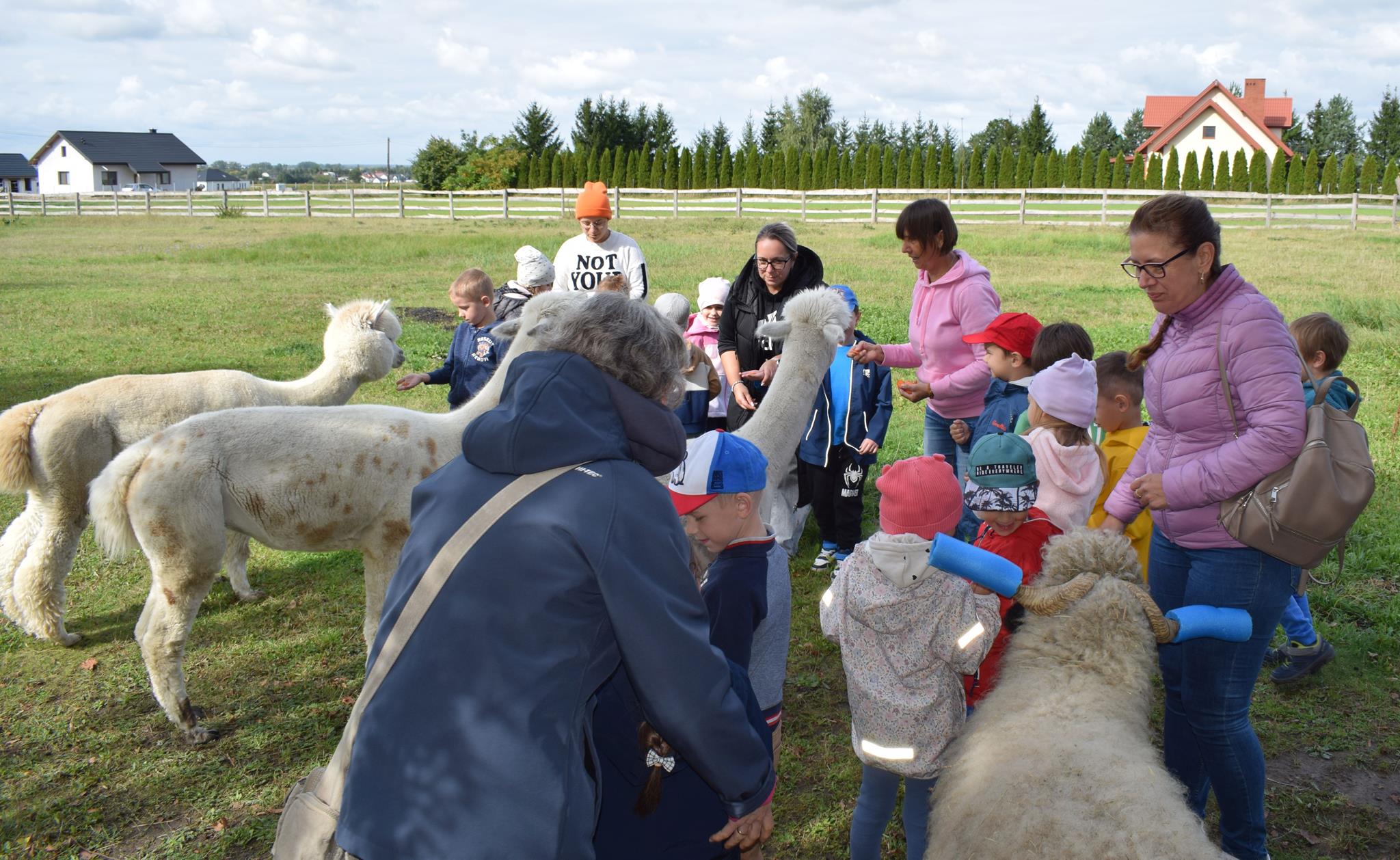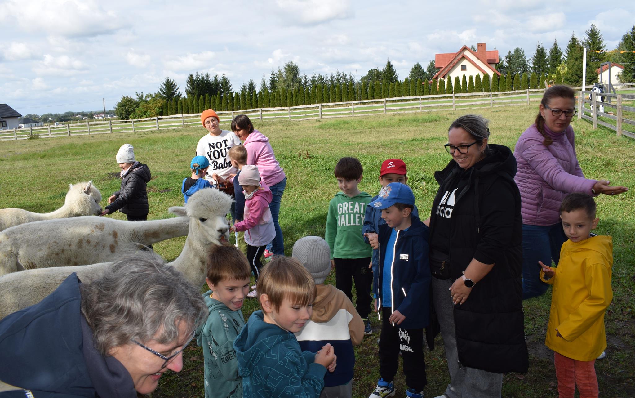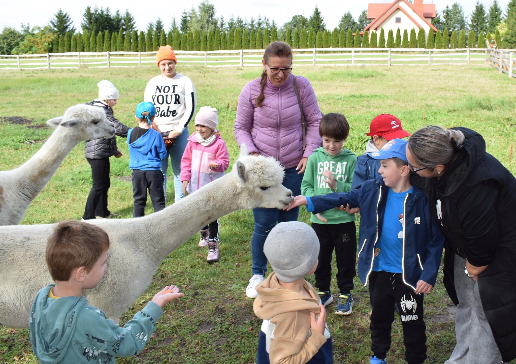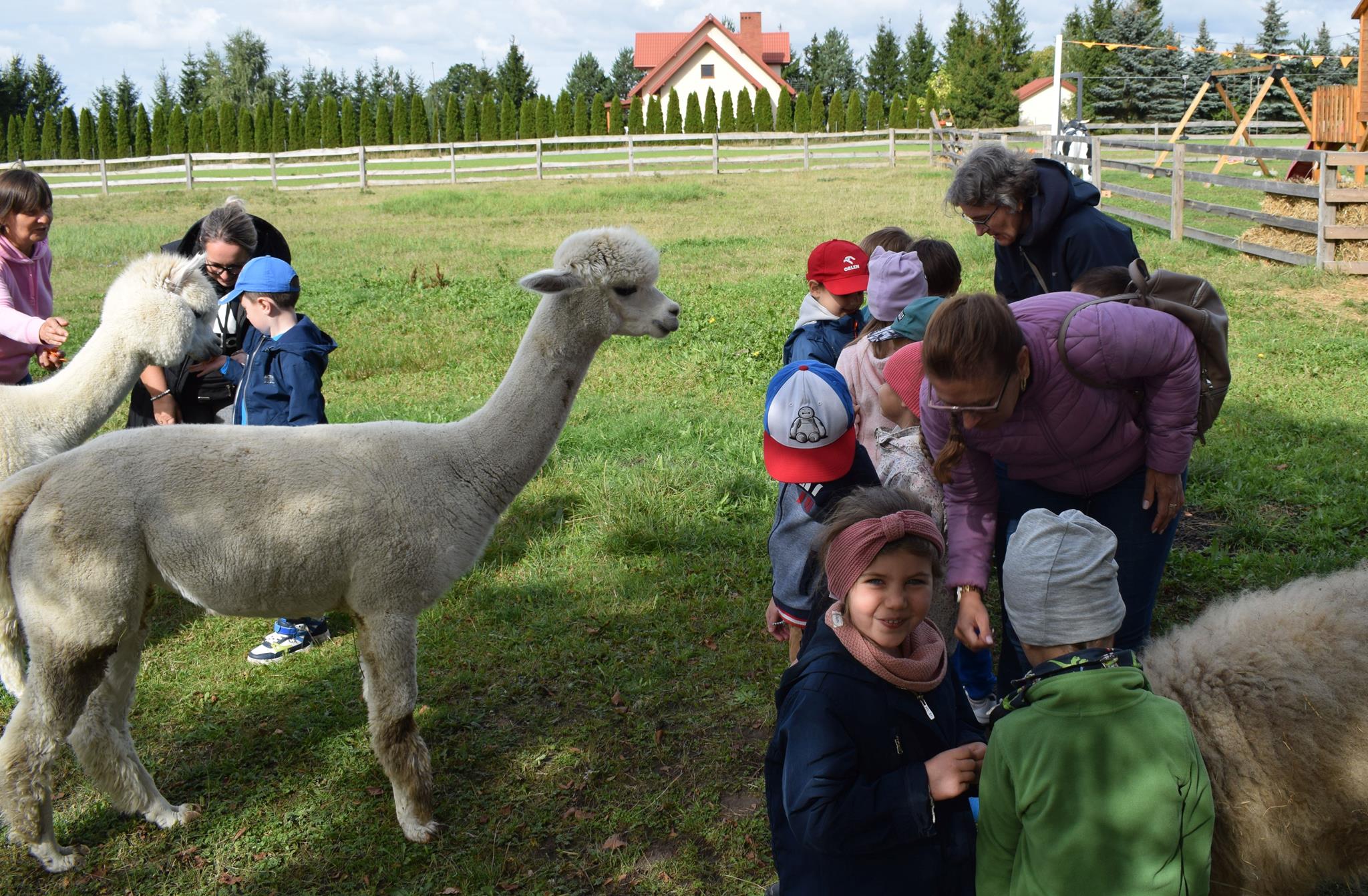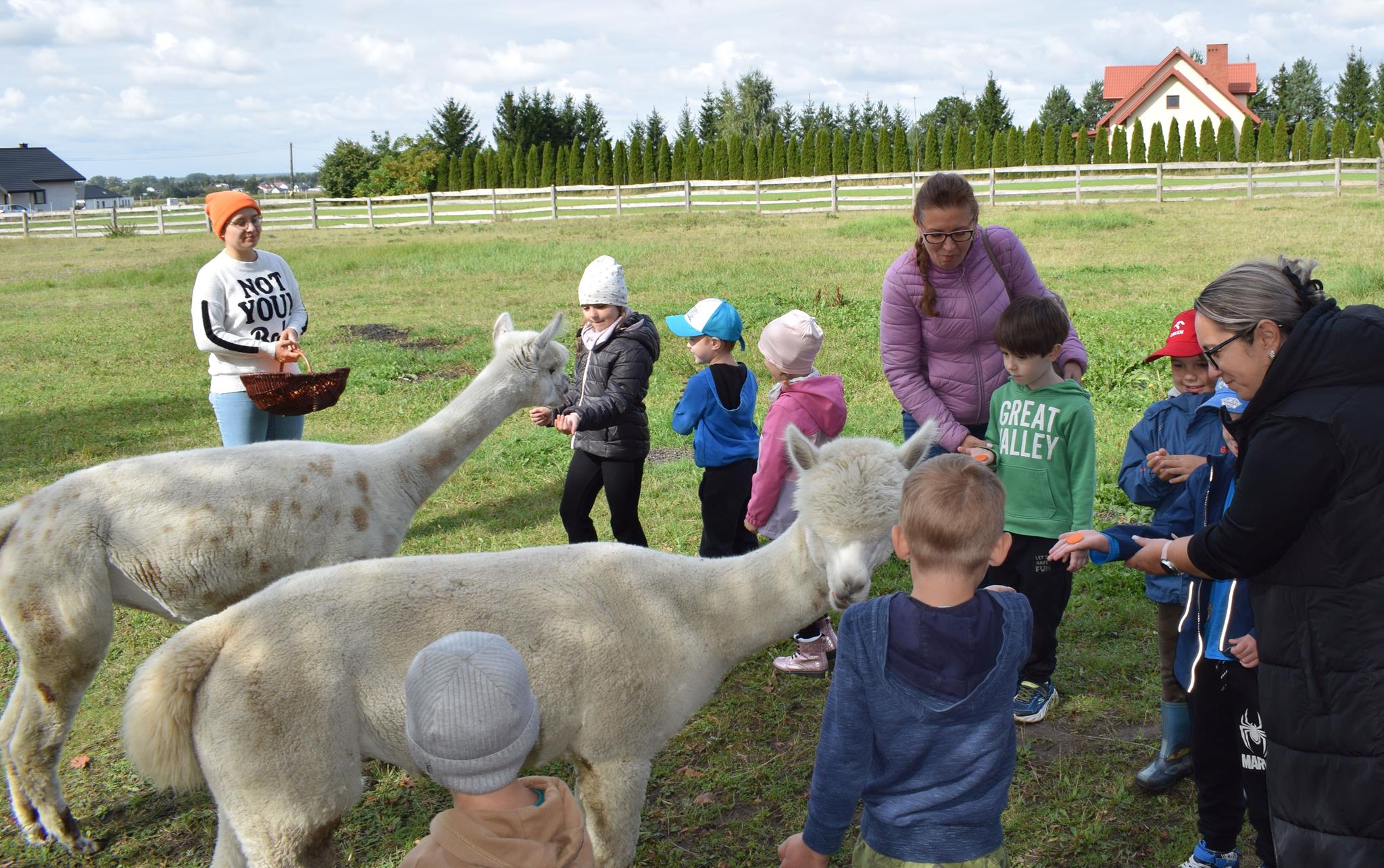 Na pierwszą wycieczkę w tym roku szkolnym wybraliśmy się do Farmy Wesołe Alpaki w miejscowości Żabokliki koło Siedlec. Najważniejszym punktem programu naszej wycieczki było spotkanie ze zwierzętami. Poznaliśmy mieszkańców farmy z bliska: alpaki, kozy, króliki, owce, osiołka, kucyka i kury. Uczyliśmy się, jak bezpiecznie i z szacunkiem obchodzić się ze zwierzątkami. Mogliśmy je pogłaskać, nakarmić, a także przytulić. Uczestniczyliśmy w jesiennych grach i zabawach, i kolejny raz przekonaliśmy się, że śmiech i ruch to najlepszy sposób na integrację! Miłych chwil doświadczyliśmy w trakcie oprowadzanek na kucyku, była to dla nas ważna lekcja zaufania do zwierząt. Dmuchańce – to prawdziwa frajda, to taka atrakcja, która nigdy się nam nie nudzi. Uczestniczyliśmy w zajęciach prowadzonych przez lekarza weterynarii. Dowiedzieliśmy się, jak wygląda praca ze zwierzętami „od kuchni”, zobaczyliśmy prawdziwe narzędzia lekarskie, mogliśmy także osłuchać serduszko kucyka. Gospodarzom farmy serdecznie dziękujemy za wszystkie atrakcje, ciekawe zajęcia, wspólną zabawę. Był to dla nas udany dzień i udana WYCIECZKA!