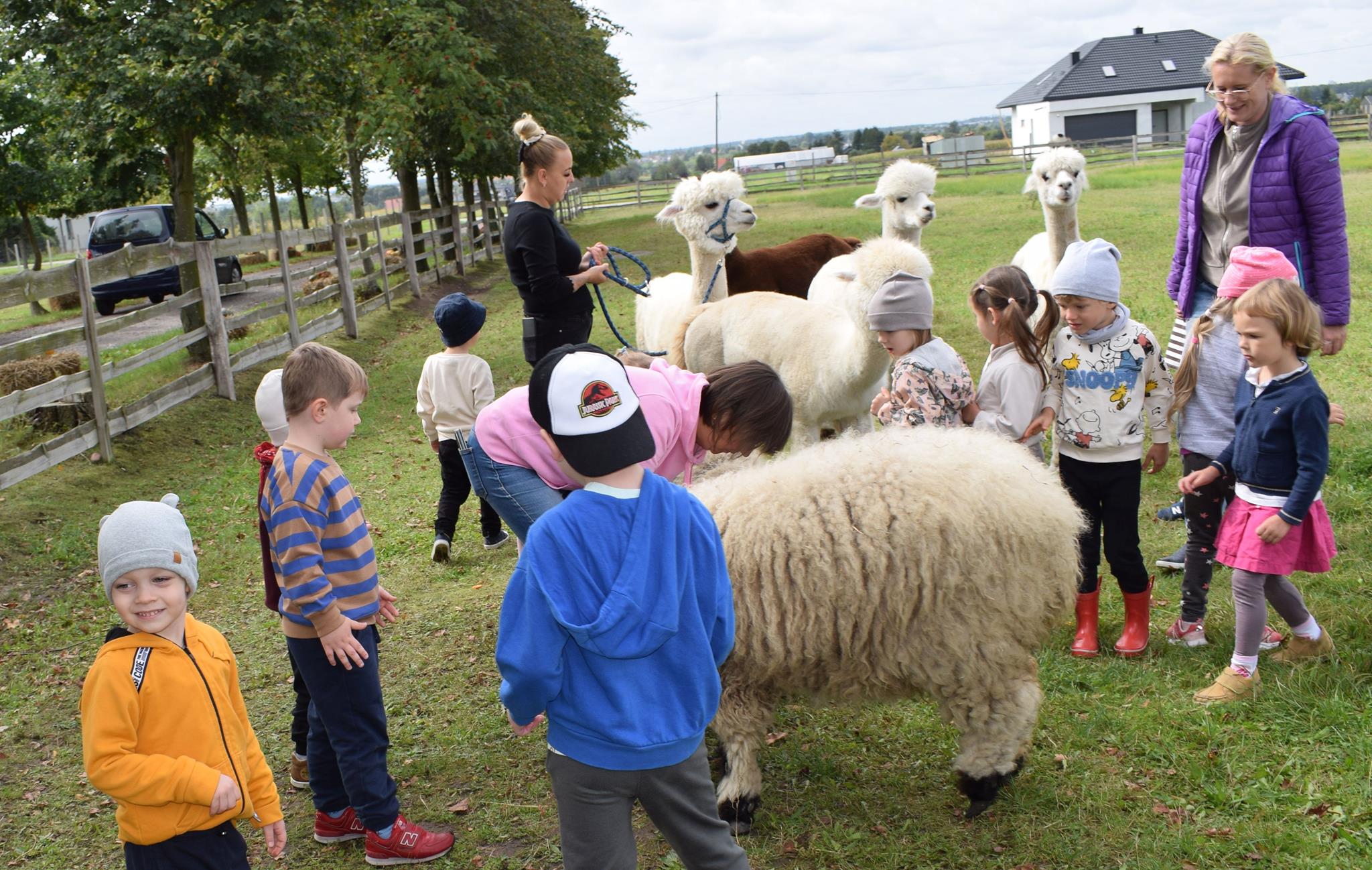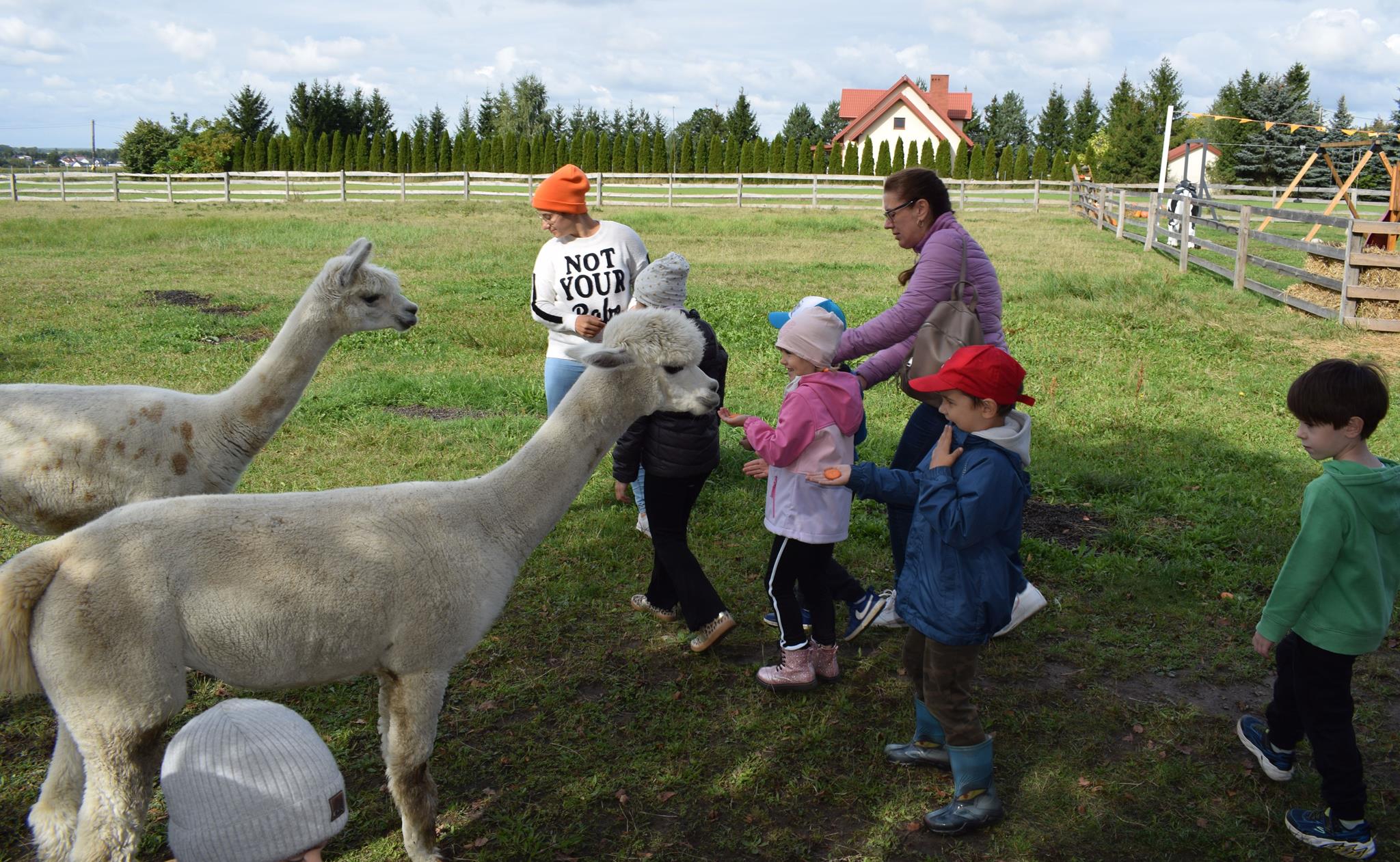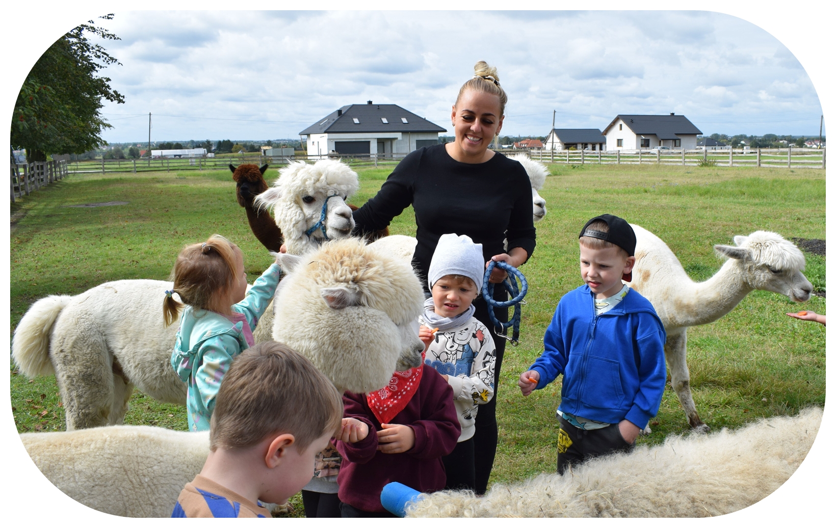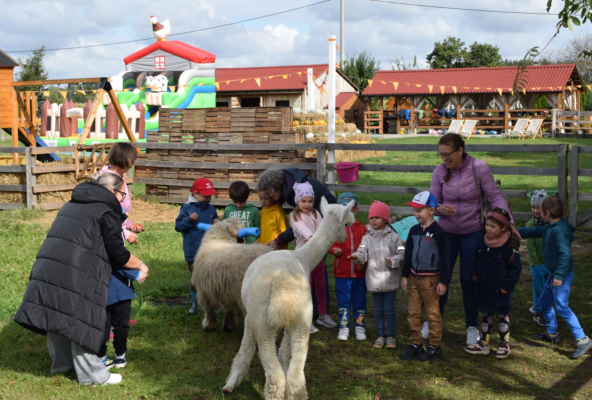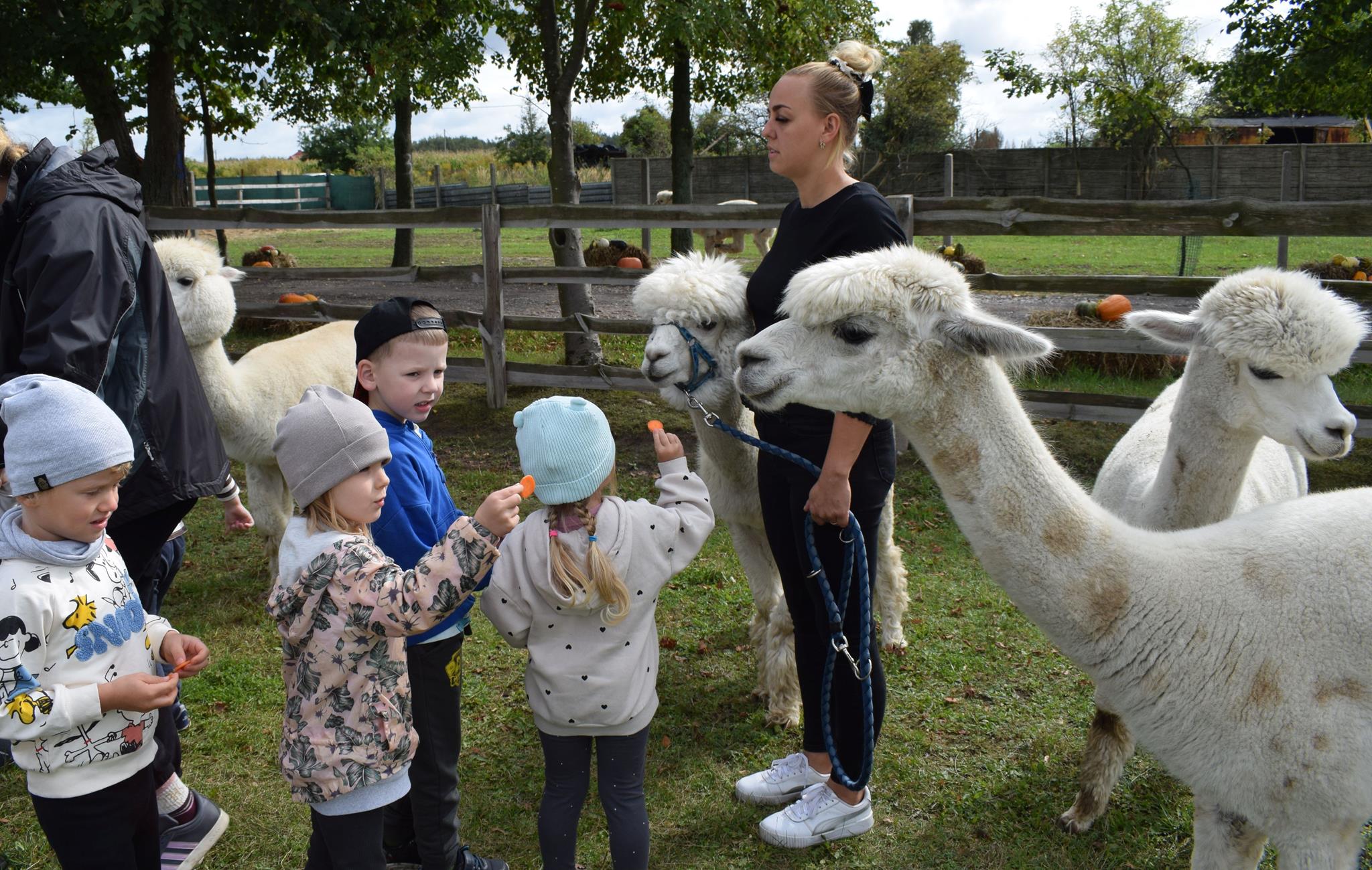 Na pierwszą wycieczkę w tym roku szkolnym wybraliśmy się do Farmy Wesołe Alpaki w miejscowości Żabokliki koło Siedlec. Najważniejszym punktem programu naszej wycieczki było spotkanie ze zwierzętami. Poznaliśmy mieszkańców farmy z bliska: alpaki, kozy, króliki, owce, osiołka, kucyka i kury. Uczyliśmy się, jak bezpiecznie i z szacunkiem obchodzić się ze zwierzątkami. Mogliśmy je pogłaskać, nakarmić, a także przytulić. Uczestniczyliśmy w jesiennych grach i zabawach, i kolejny raz przekonaliśmy się, że śmiech i ruch to najlepszy sposób na integrację! Miłych chwil doświadczyliśmy w trakcie oprowadzanek na kucyku, była to dla nas ważna lekcja zaufania do zwierząt. Dmuchańce – to prawdziwa frajda, to taka atrakcja, która nigdy się nam nie nudzi. Uczestniczyliśmy w zajęciach prowadzonych przez lekarza weterynarii. Dowiedzieliśmy się, jak wygląda praca ze zwierzętami „od kuchni”, zobaczyliśmy prawdziwe narzędzia lekarskie, mogliśmy także osłuchać serduszko kucyka. Gospodarzom farmy serdecznie dziękujemy za wszystkie atrakcje, ciekawe zajęcia, wspólną zabawę. Był to dla nas udany dzień i udana WYCIECZKA!