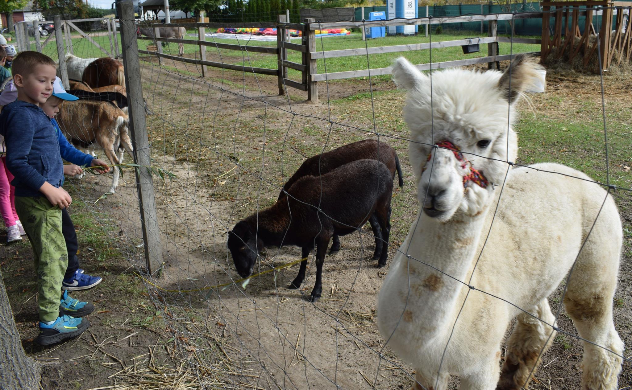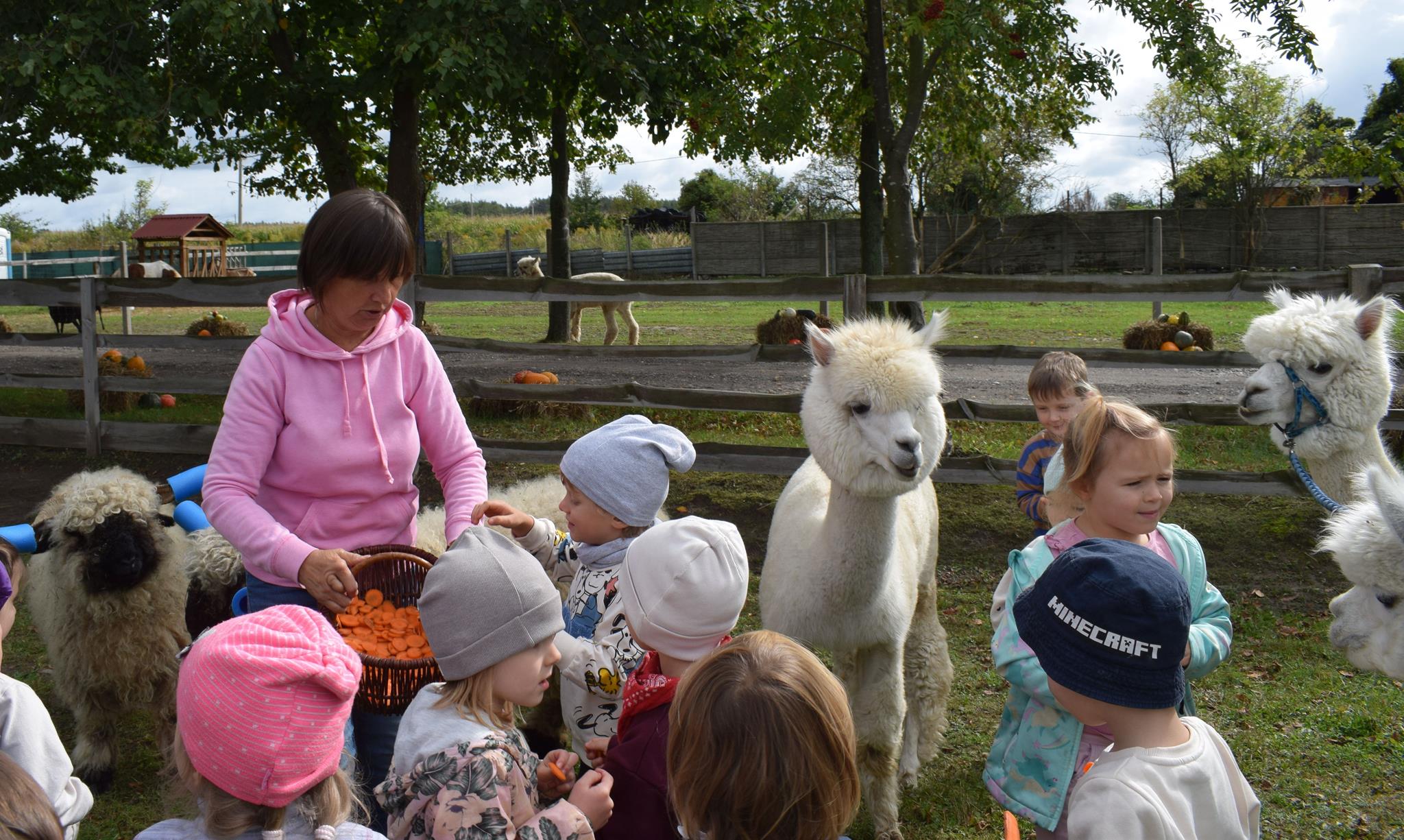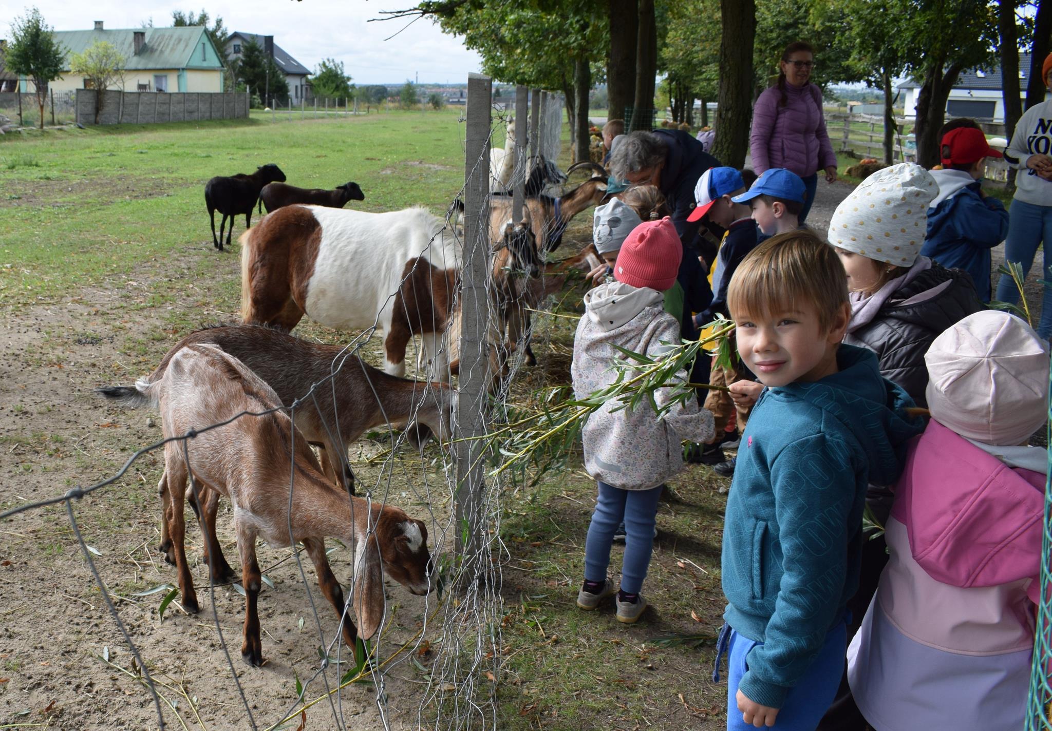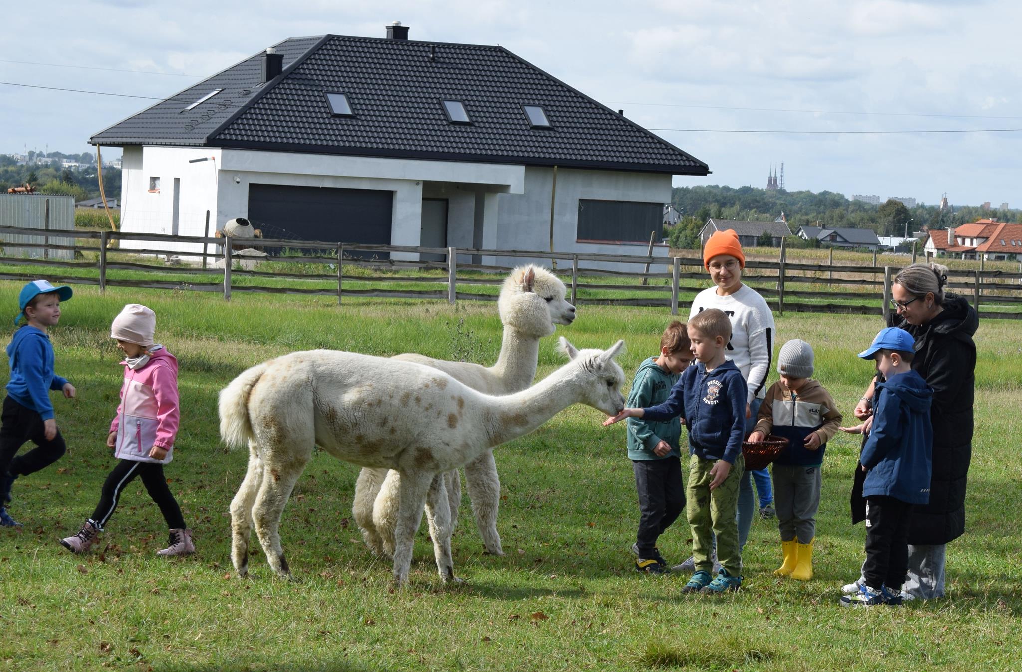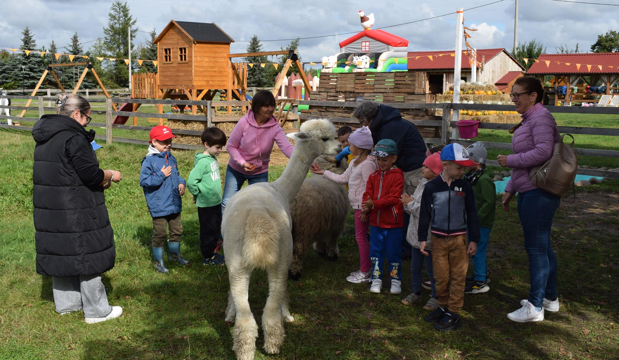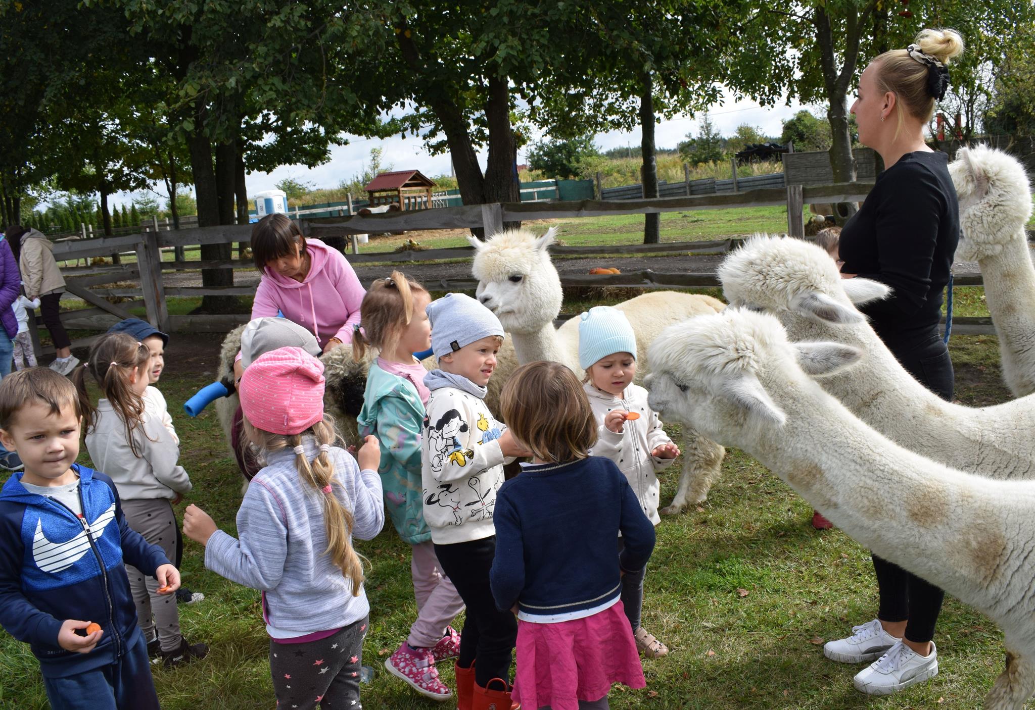 Na pierwszą wycieczkę w tym roku szkolnym wybraliśmy się do Farmy Wesołe Alpaki w miejscowości Żabokliki koło Siedlec. Najważniejszym punktem programu naszej wycieczki było spotkanie ze zwierzętami. Poznaliśmy mieszkańców farmy z bliska: alpaki, kozy, króliki, owce, osiołka, kucyka i kury. Uczyliśmy się, jak bezpiecznie i z szacunkiem obchodzić się ze zwierzątkami. Mogliśmy je pogłaskać, nakarmić, a także przytulić. Uczestniczyliśmy w jesiennych grach i zabawach, i kolejny raz przekonaliśmy się, że śmiech i ruch to najlepszy sposób na integrację! Miłych chwil doświadczyliśmy w trakcie oprowadzanek na kucyku, była to dla nas ważna lekcja zaufania do zwierząt. Dmuchańce – to prawdziwa frajda, to taka atrakcja, która nigdy się nam nie nudzi. Uczestniczyliśmy w zajęciach prowadzonych przez lekarza weterynarii. Dowiedzieliśmy się, jak wygląda praca ze zwierzętami „od kuchni”, zobaczyliśmy prawdziwe narzędzia lekarskie, mogliśmy także osłuchać serduszko kucyka. Gospodarzom farmy serdecznie dziękujemy za wszystkie atrakcje, ciekawe zajęcia, wspólną zabawę. Był to dla nas udany dzień i udana WYCIECZKA!