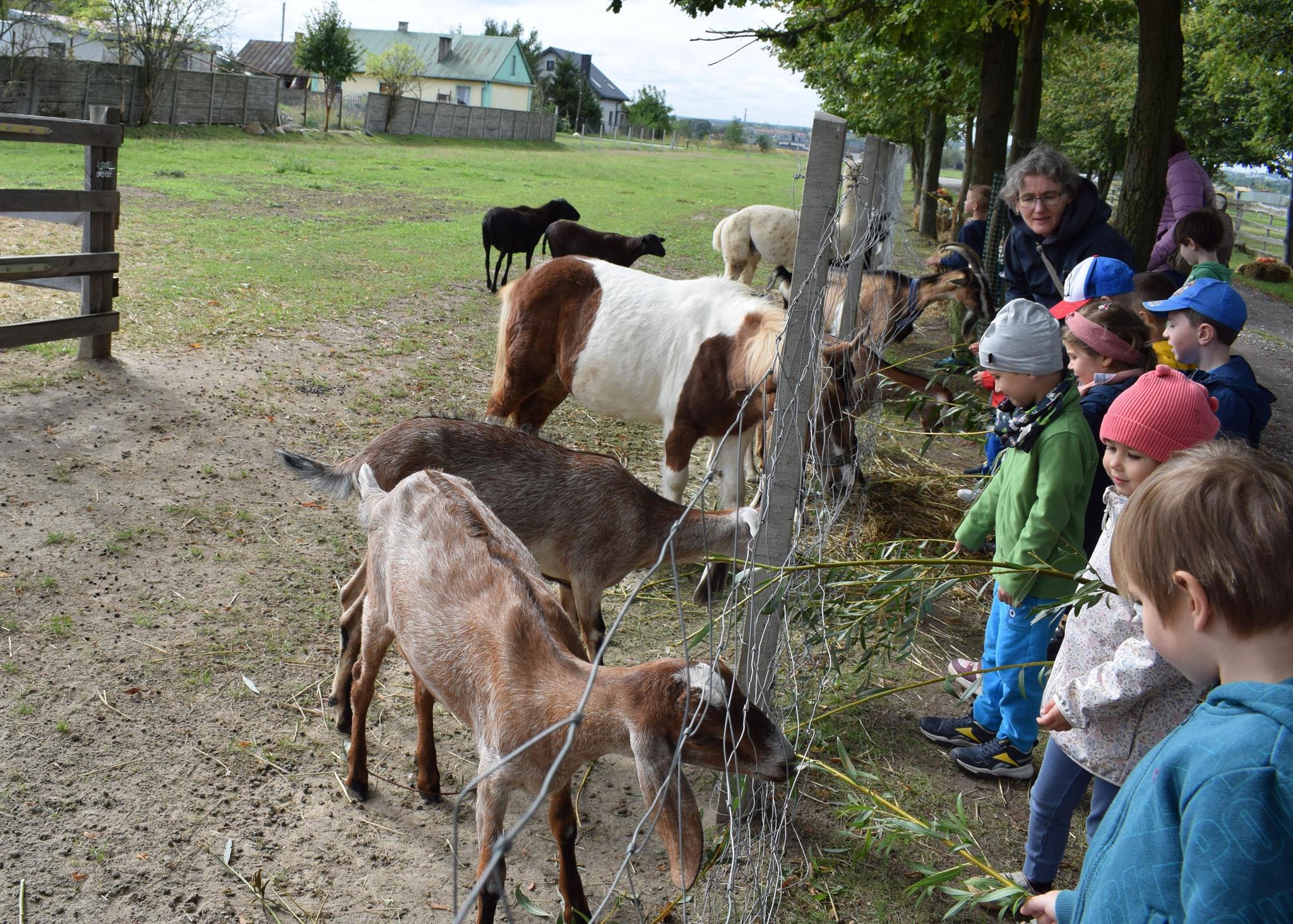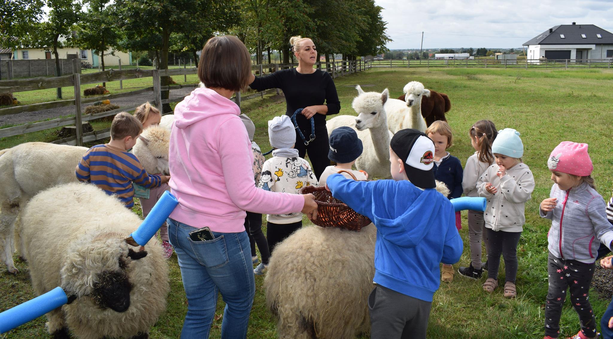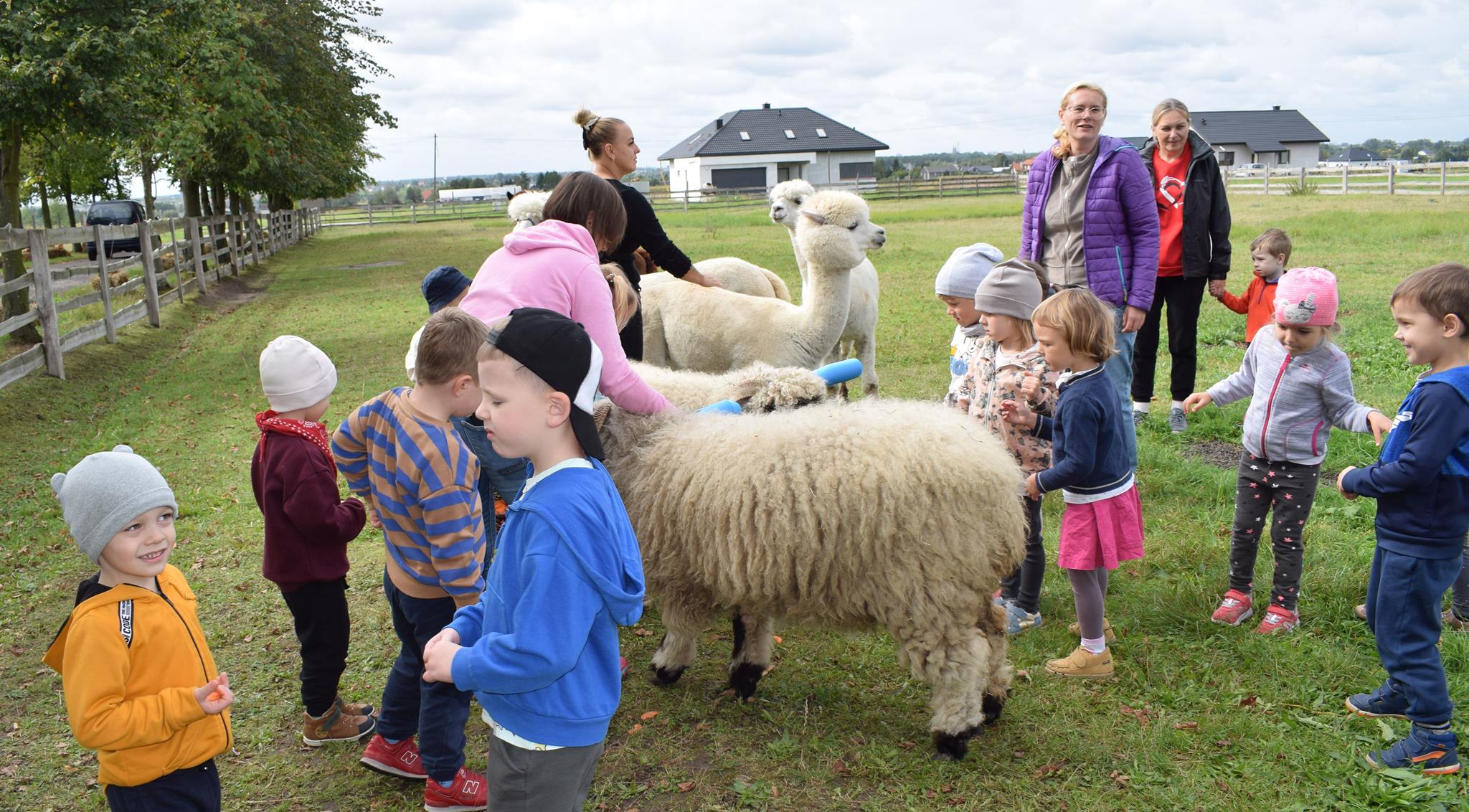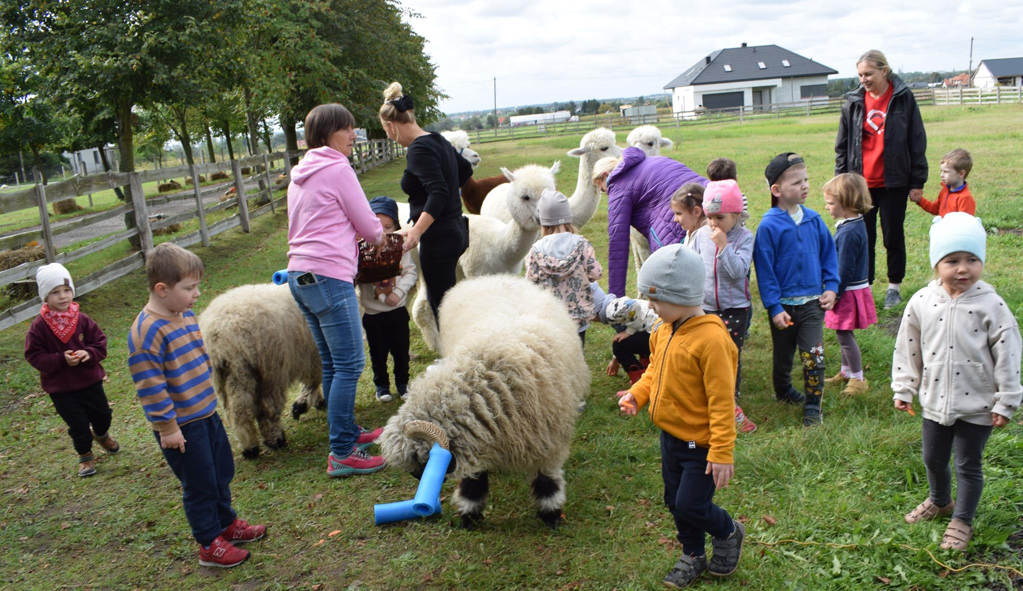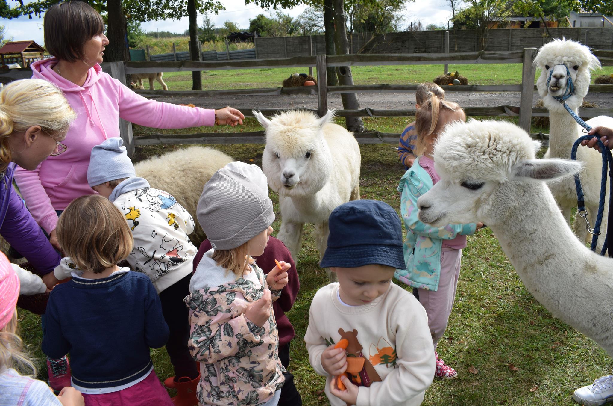 Na pierwszą wycieczkę w tym roku szkolnym wybraliśmy się do Farmy Wesołe Alpaki w miejscowości Żabokliki koło Siedlec. Najważniejszym punktem programu naszej wycieczki było spotkanie ze zwierzętami. Poznaliśmy mieszkańców farmy z bliska: alpaki, kozy, króliki, owce, osiołka, kucyka i kury. Uczyliśmy się, jak bezpiecznie i z szacunkiem obchodzić się ze zwierzątkami. Mogliśmy je pogłaskać, nakarmić, a także przytulić. Uczestniczyliśmy w jesiennych grach i zabawach, i kolejny raz przekonaliśmy się, że śmiech i ruch to najlepszy sposób na integrację! Miłych chwil doświadczyliśmy w trakcie oprowadzanek na kucyku, była to dla nas ważna lekcja zaufania do zwierząt. Dmuchańce – to prawdziwa frajda, to taka atrakcja, która nigdy się nam nie nudzi. Uczestniczyliśmy w zajęciach prowadzonych przez lekarza weterynarii. Dowiedzieliśmy się, jak wygląda praca ze zwierzętami „od kuchni”, zobaczyliśmy prawdziwe narzędzia lekarskie, mogliśmy także osłuchać serduszko kucyka. Gospodarzom farmy serdecznie dziękujemy za wszystkie atrakcje, ciekawe zajęcia, wspólną zabawę. Był to dla nas udany dzień i udana WYCIECZKA!