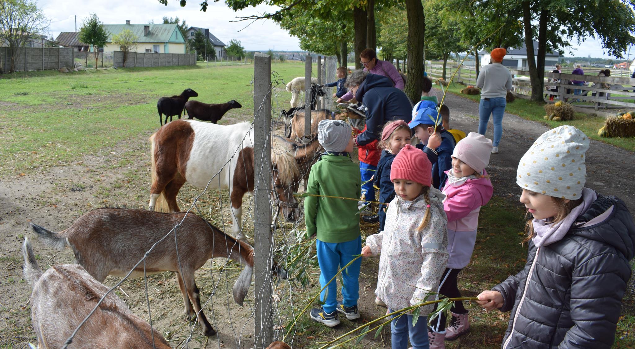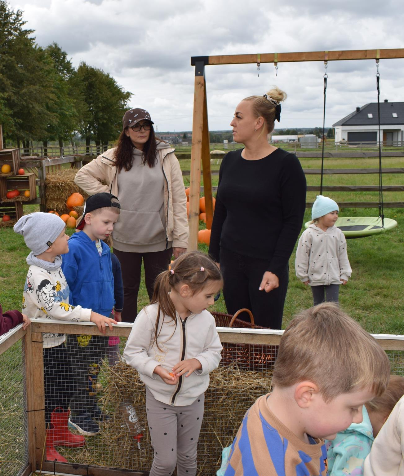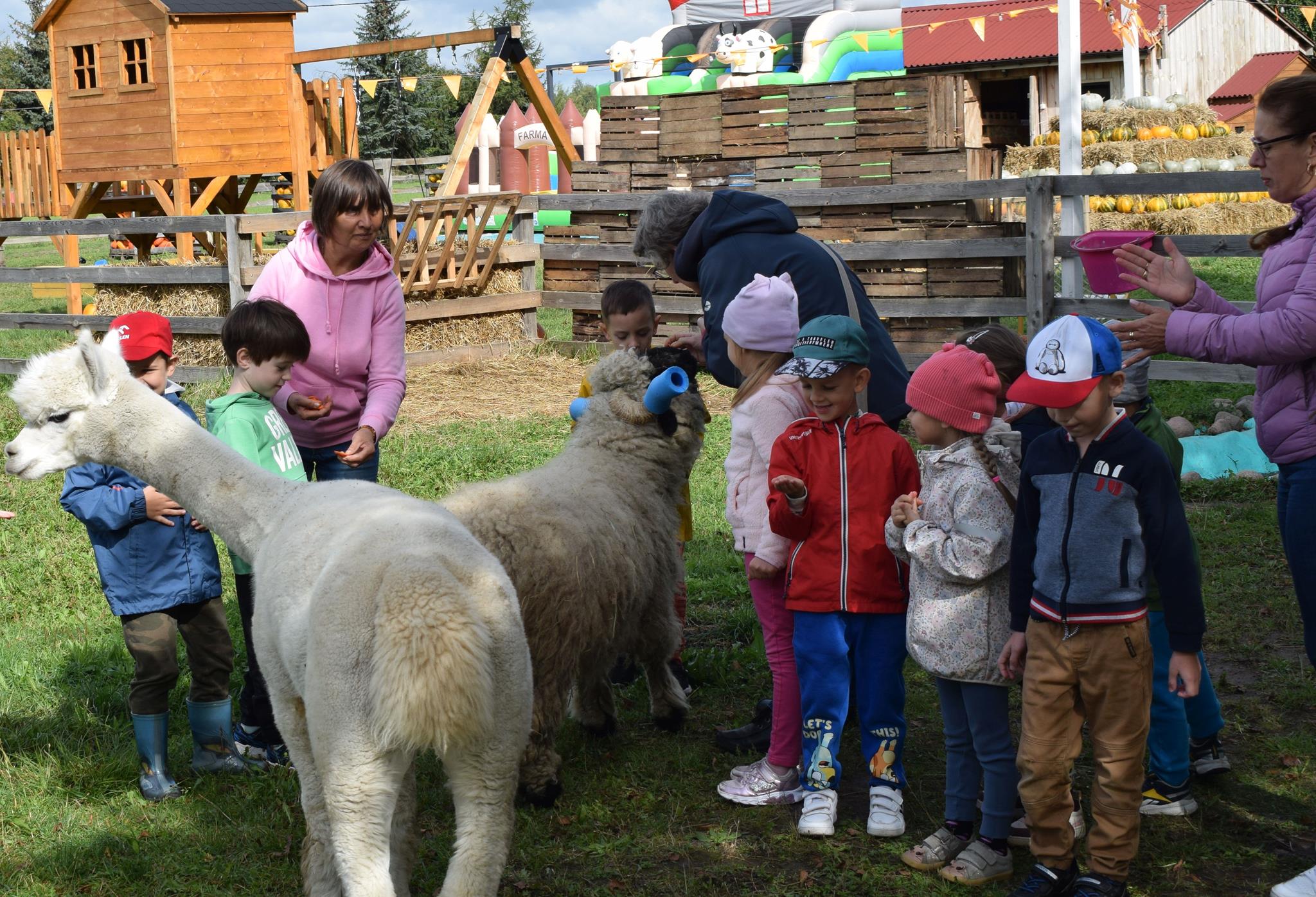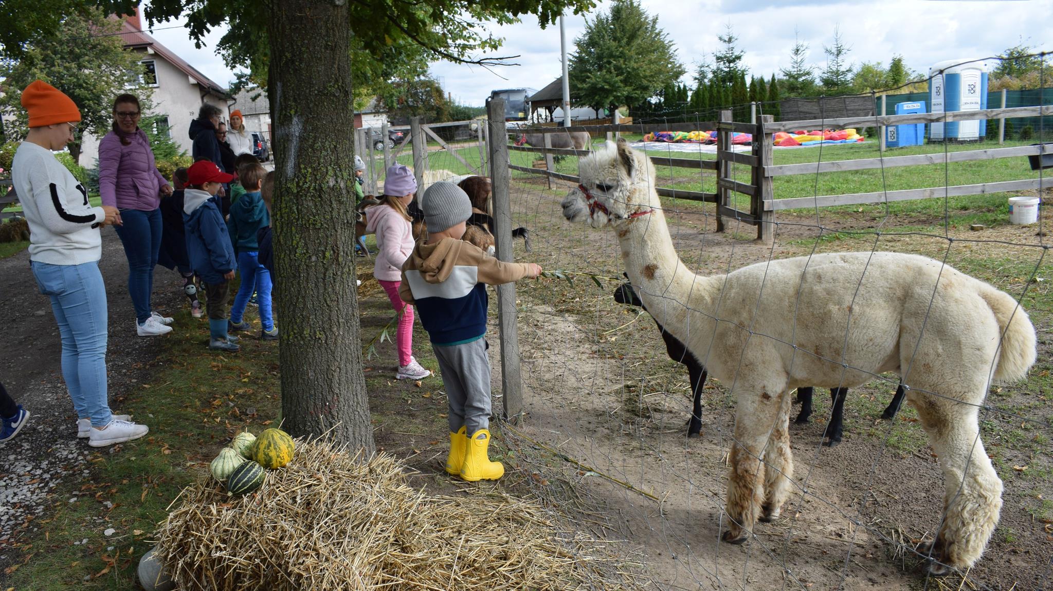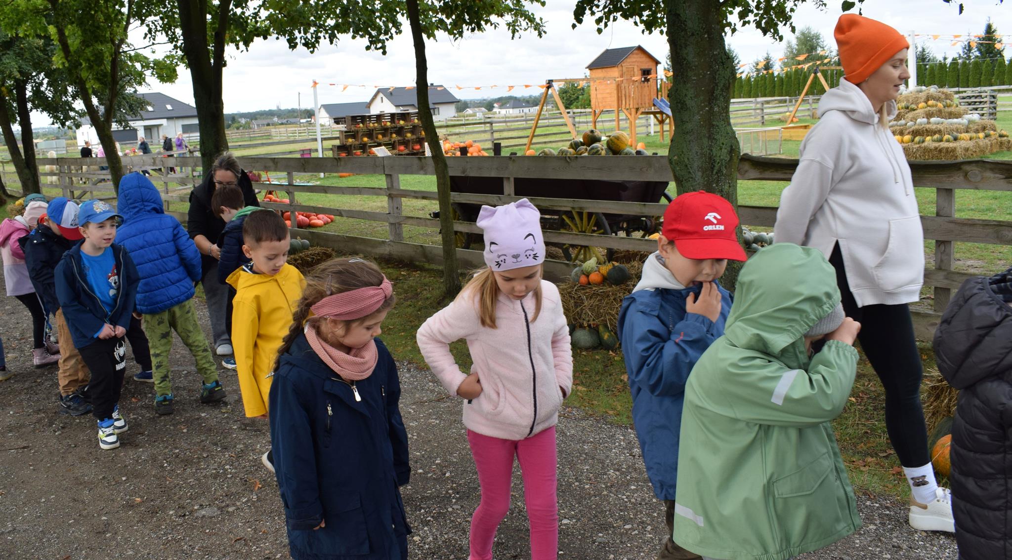 Na pierwszą wycieczkę w tym roku szkolnym wybraliśmy się do Farmy Wesołe Alpaki w miejscowości Żabokliki koło Siedlec. Najważniejszym punktem programu naszej wycieczki było spotkanie ze zwierzętami. Poznaliśmy mieszkańców farmy z bliska: alpaki, kozy, króliki, owce, osiołka, kucyka i kury. Uczyliśmy się, jak bezpiecznie i z szacunkiem obchodzić się ze zwierzątkami. Mogliśmy je pogłaskać, nakarmić, a także przytulić. Uczestniczyliśmy w jesiennych grach i zabawach, i kolejny raz przekonaliśmy się, że śmiech i ruch to najlepszy sposób na integrację! Miłych chwil doświadczyliśmy w trakcie oprowadzanek na kucyku, była to dla nas ważna lekcja zaufania do zwierząt. Dmuchańce – to prawdziwa frajda, to taka atrakcja, która nigdy się nam nie nudzi. Uczestniczyliśmy w zajęciach prowadzonych przez lekarza weterynarii. Dowiedzieliśmy się, jak wygląda praca ze zwierzętami „od kuchni”, zobaczyliśmy prawdziwe narzędzia lekarskie, mogliśmy także osłuchać serduszko kucyka. Gospodarzom farmy serdecznie dziękujemy za wszystkie atrakcje, ciekawe zajęcia, wspólną zabawę. Był to dla nas udany dzień i udana WYCIECZKA!