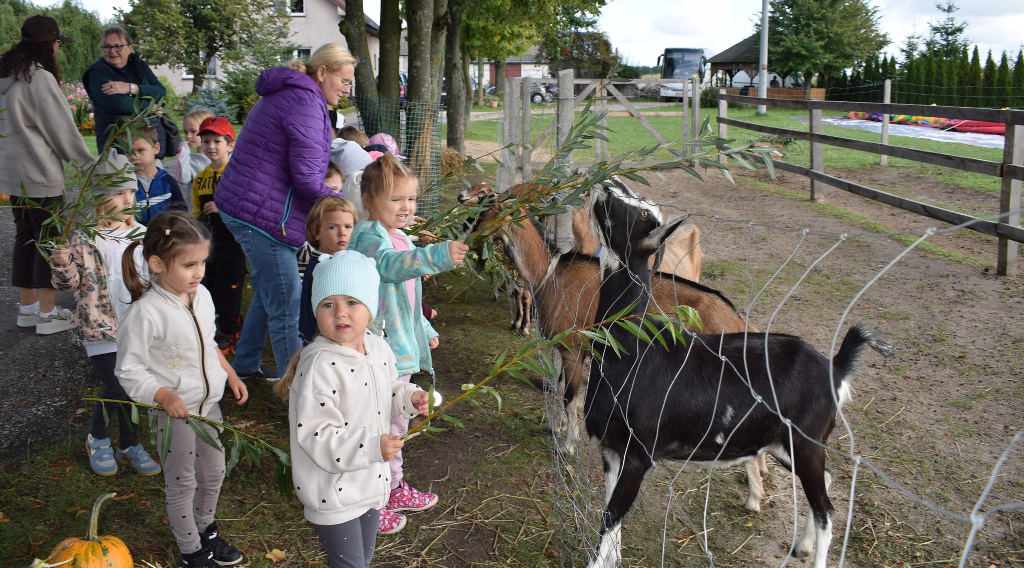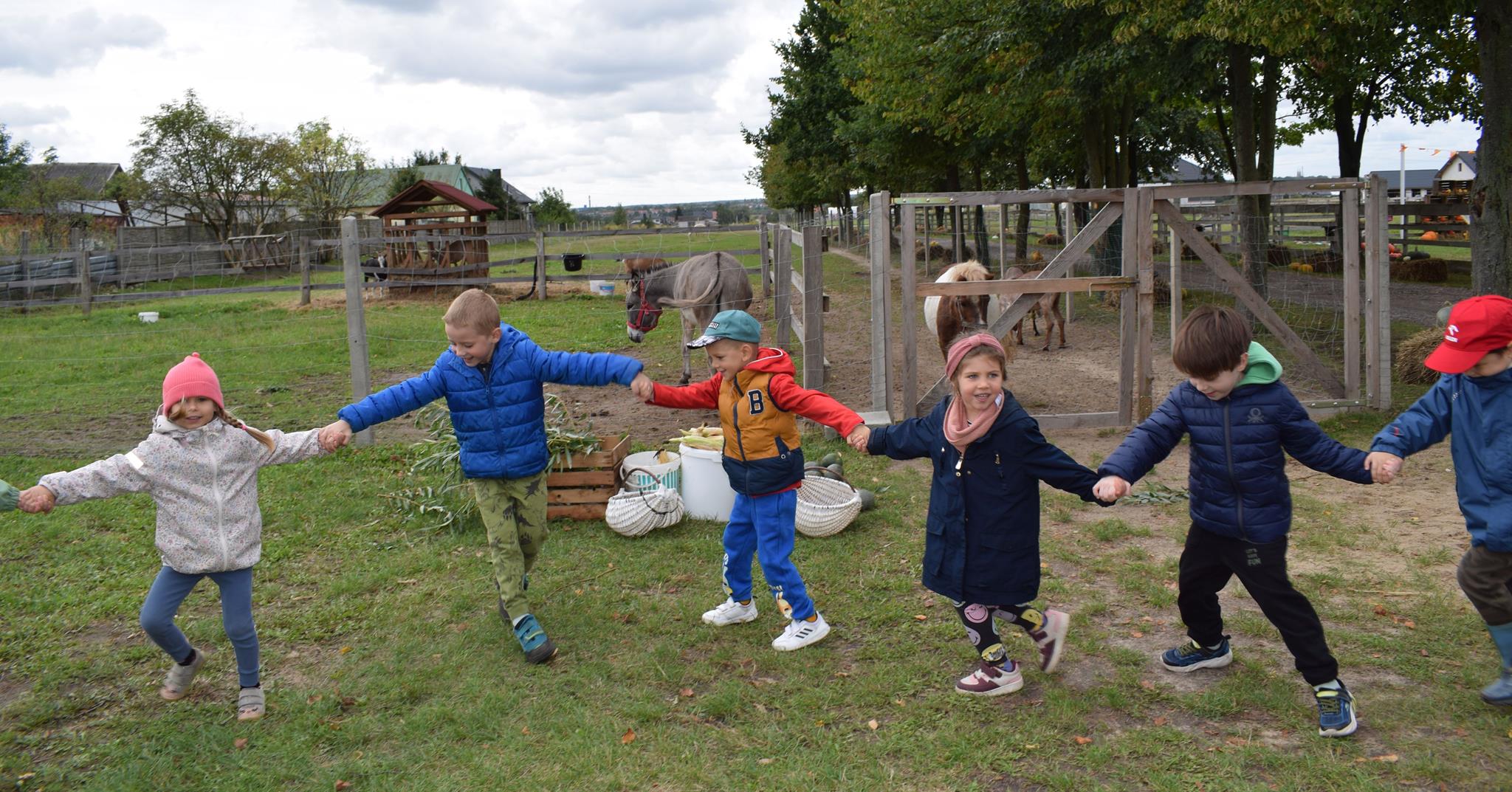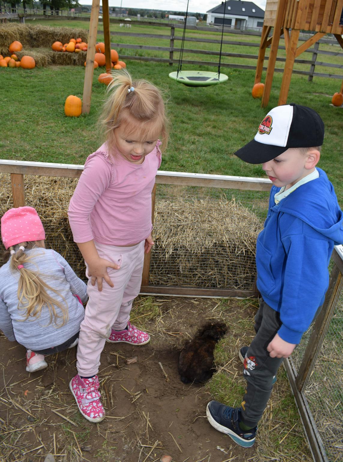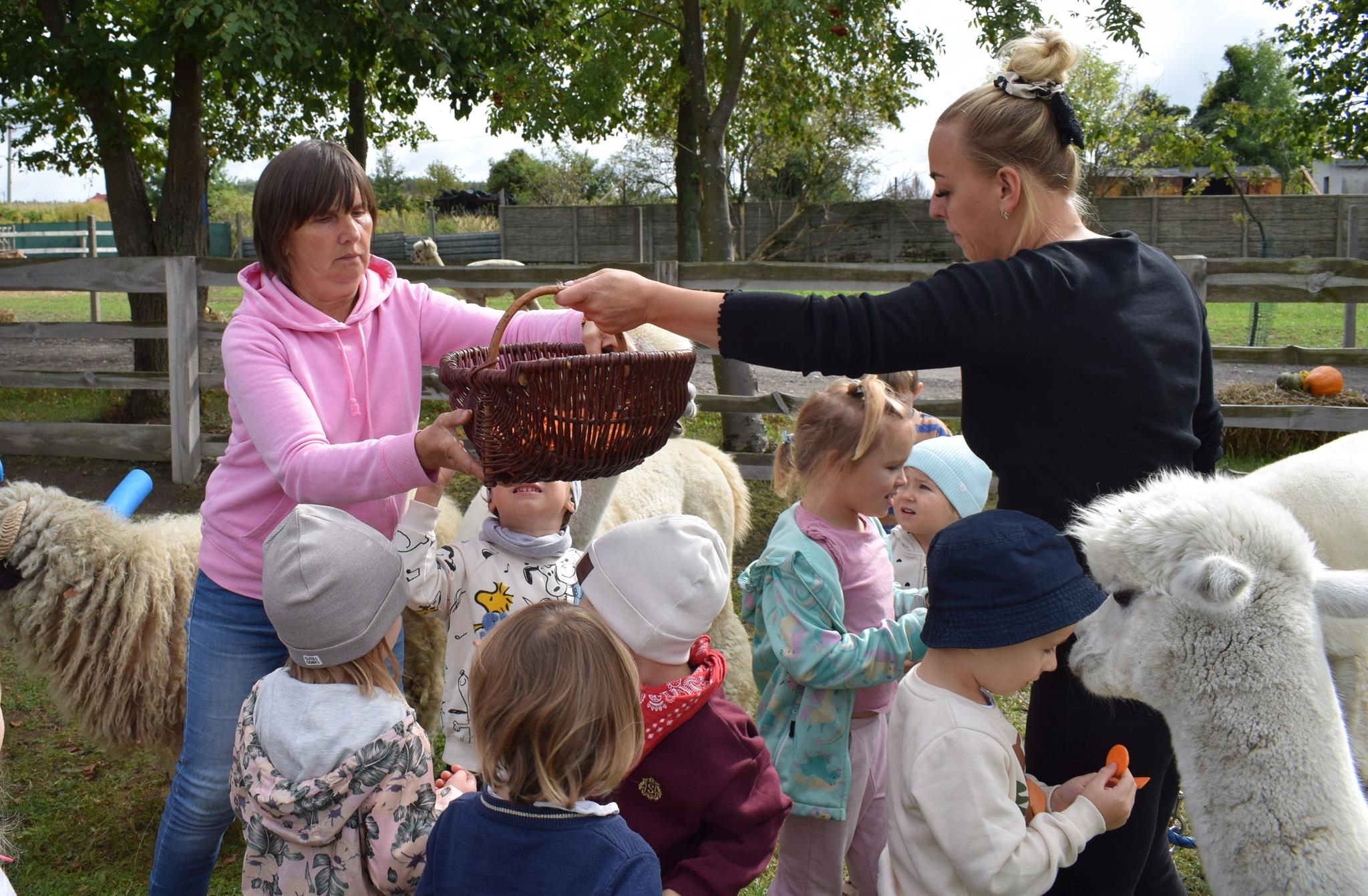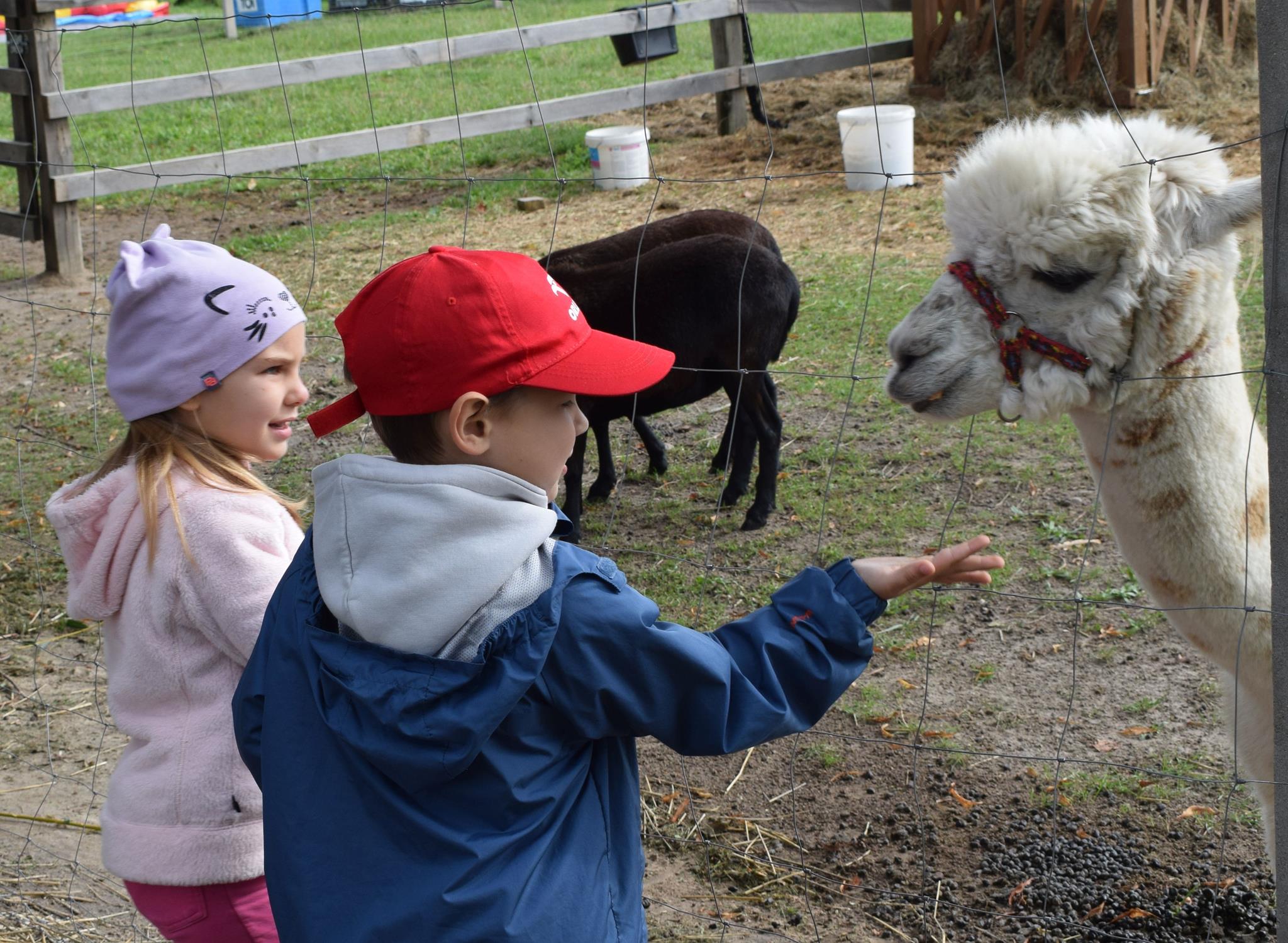 Na pierwszą wycieczkę w tym roku szkolnym wybraliśmy się do Farmy Wesołe Alpaki w miejscowości Żabokliki koło Siedlec. Najważniejszym punktem programu naszej wycieczki było spotkanie ze zwierzętami. Poznaliśmy mieszkańców farmy z bliska: alpaki, kozy, króliki, owce, osiołka, kucyka i kury. Uczyliśmy się, jak bezpiecznie i z szacunkiem obchodzić się ze zwierzątkami. Mogliśmy je pogłaskać, nakarmić, a także przytulić. Uczestniczyliśmy w jesiennych grach i zabawach, i kolejny raz przekonaliśmy się, że śmiech i ruch to najlepszy sposób na integrację! Miłych chwil doświadczyliśmy w trakcie oprowadzanek na kucyku, była to dla nas ważna lekcja zaufania do zwierząt. Dmuchańce – to prawdziwa frajda, to taka atrakcja, która nigdy się nam nie nudzi. Uczestniczyliśmy w zajęciach prowadzonych przez lekarza weterynarii. Dowiedzieliśmy się, jak wygląda praca ze zwierzętami „od kuchni”, zobaczyliśmy prawdziwe narzędzia lekarskie, mogliśmy także osłuchać serduszko kucyka. Gospodarzom farmy serdecznie dziękujemy za wszystkie atrakcje, ciekawe zajęcia, wspólną zabawę. Był to dla nas udany dzień i udana WYCIECZKA!