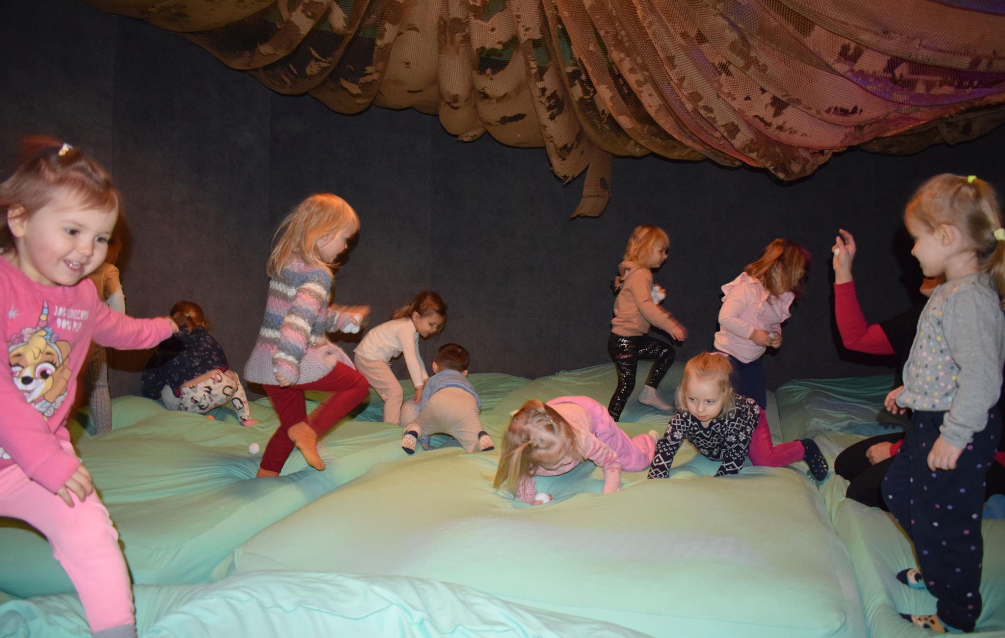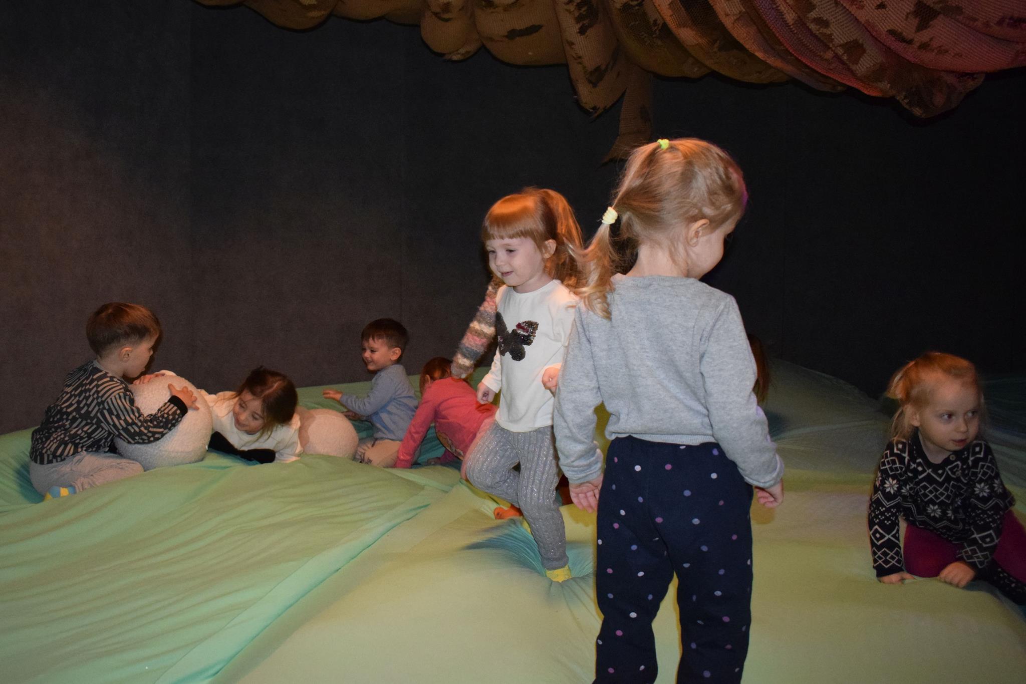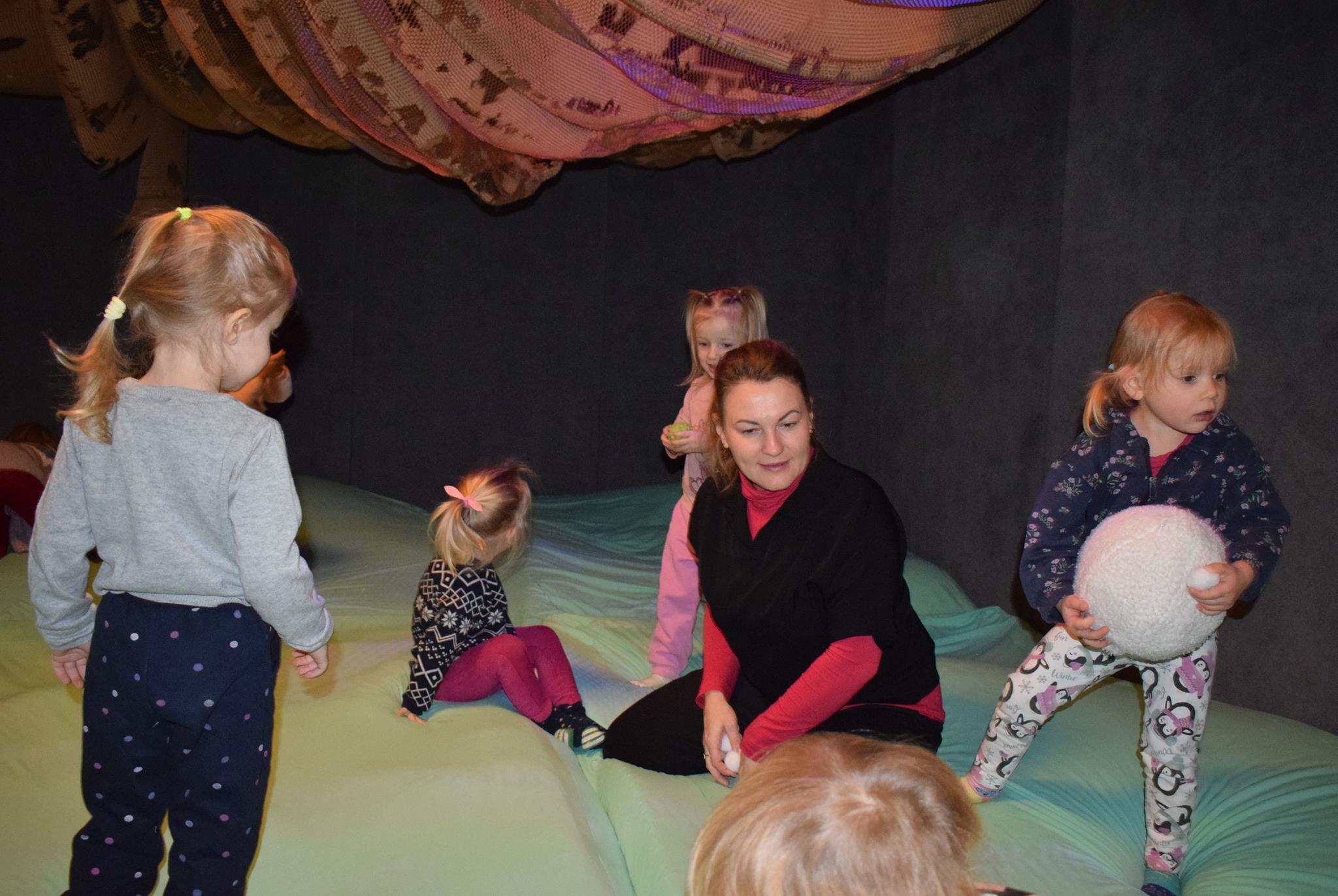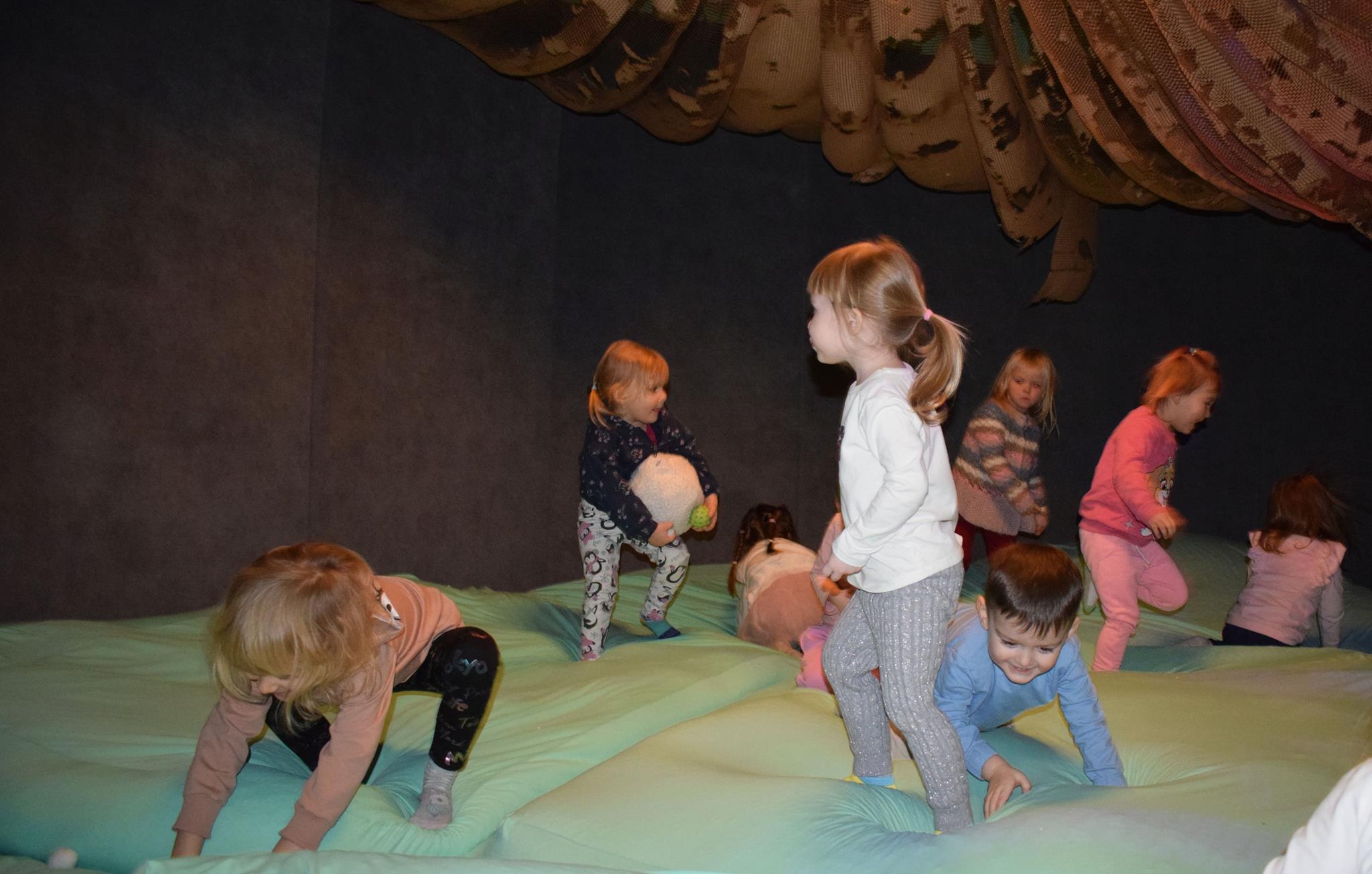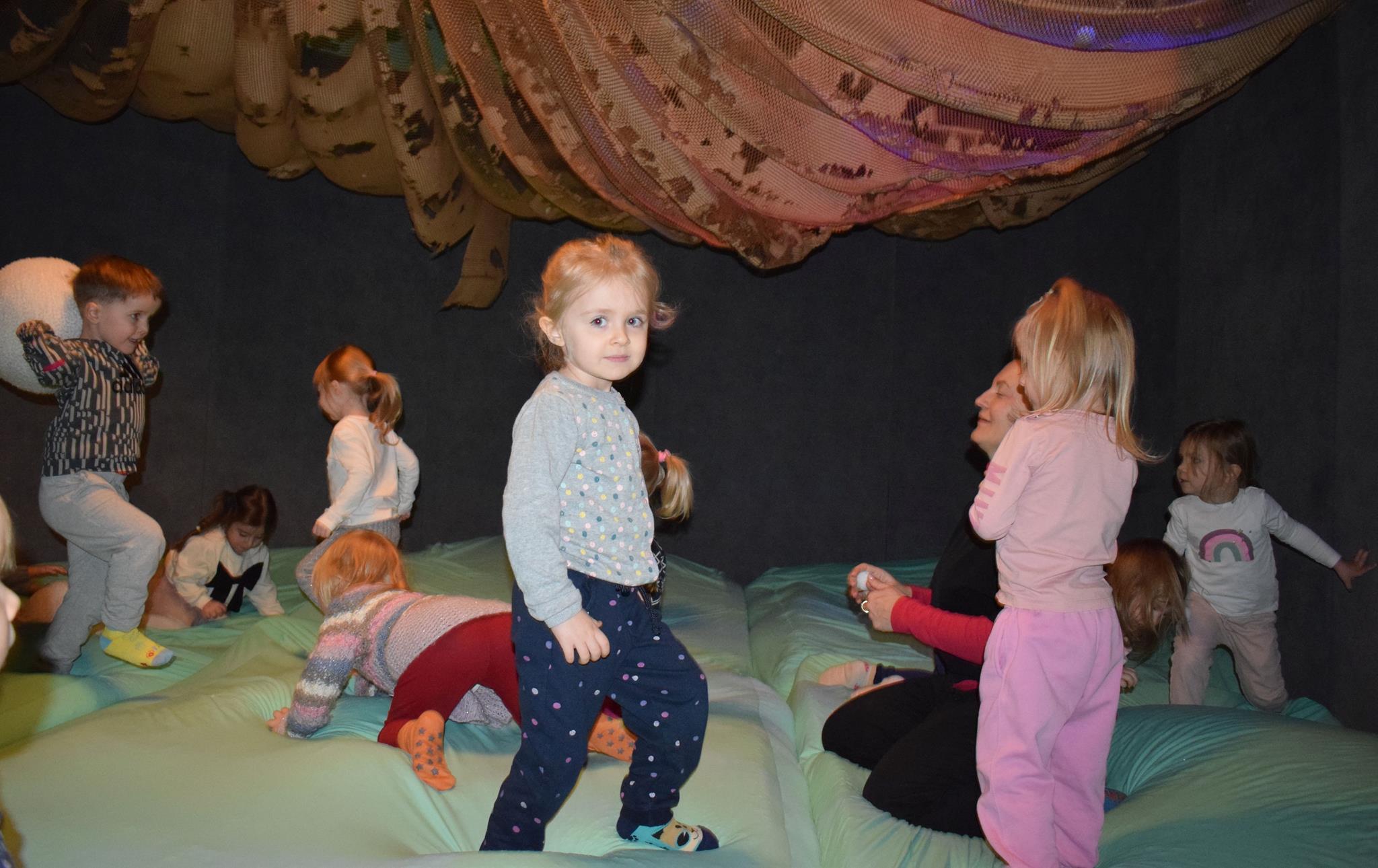 Najmłodsze dzieci z gr. Delfinki wybrały się do Sali Zabaw Sensorysie, gdzie czekało je wiele atrakcji: spotkanie z interaktywnym Rysiem, pełna przygód podóż w kosmos, udział w zajęciach plastyczno-sensorycznych, mnóstwo czasu na zabawę ruchową. Do dyspozycji były zjeżdżalnie, ścianka wspinaczkowa, labirynt sensoryczny, tunel z siatki, trampoliny, strefa lasu, jasknia foczek z kulkami, magnetyczne klocki, tablice manipulacyjne. Sensorysie to piękna sala zabaw, stworzona z myślą o dzieciach i ich rozwoju, dostosowana do potrzeb najmłodszych, zachęciła dzieci do aktywności i eksploracji świata zmysłów.